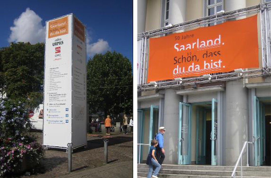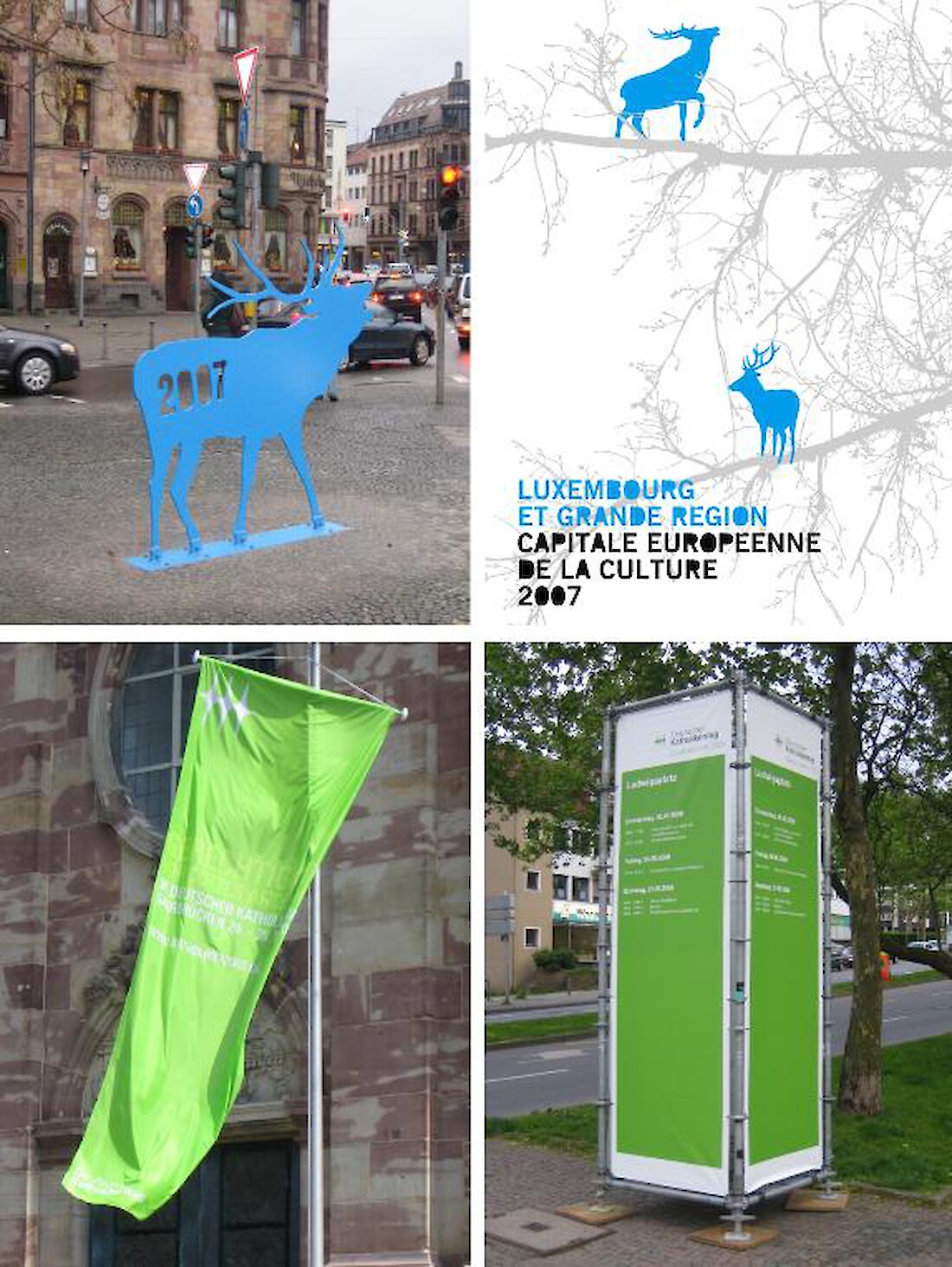 Ach, was haben wir uns gefreut auf das Landesfest zum fünfzigjährigen Bestehens des Bundeslandes Saarland. Ein Wochenende lang wurde zwischen Patricia Kaas und Kulisaaria kräftig gefeiert und die Zukunftsfähigkeit des Landes beschworen. Doch wie wurde dieser Anspruch visuell umgesetzt? Konnte auf der Geburtstagsparty eine Form des Designs, der Grafik und Architektur gefunden werden, die Identität, Selbstbewusstsein und Modernität ausstrahlte? Das Ergebnis ist ernüchternd und zeigt, dass das Erscheinungsbild des Landes trotz 50 Jahre noch in den Kinderschuhen steckt: das Jubiläumslogo modisch kurzlebig und wenig einprägsam, ein Wegeleitsystem hausbacken und überfrachtet mit Werbung, eine Programmbroschüre unübersichtlich und lieblos zusammengestellt. Ganz zu schweigen von einer irgendwie gearteten gestalterischen Linie, die die vielen Stände und Bühnen in der Saarbrücker Innenstadt hätte verbinden können. Am Geldmangel kann es nicht gelegen haben, eher am Willen. Das man ein Grossereignis mit einem charakteristischen und experimentierfreudigen Design prägen kann und unverwechselbar macht, beweist dagegen die Europäische Kulturhauptstadt 2007 in Luxemburg und Grossregion. Deren Logo, der blaue Hirsch, besitzt zudem noch Humor - eine Seltenheit in der Welt des Kommunikationsdesigns - , in dem die Bildmarke immer wieder spielerisch variiert wird, ohne dass der Wiedererkennungswert verloren geht. Oder ein Blick zurück vor garnicht allzu langer Zeit: das Erscheinungsbild des Deutschen Katholikentages, der 2006 in Saarbrücken stattfand und den öffentlichen Raum mit einem ungewohnt frischen und ganzheitlichen Design bereicherte.
