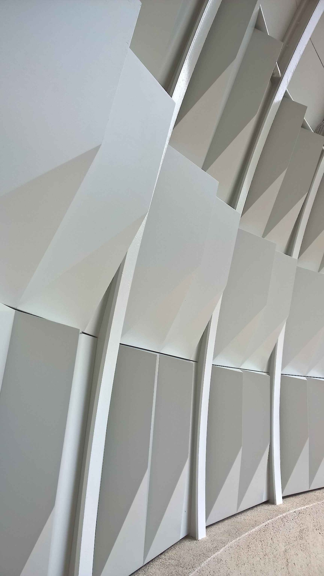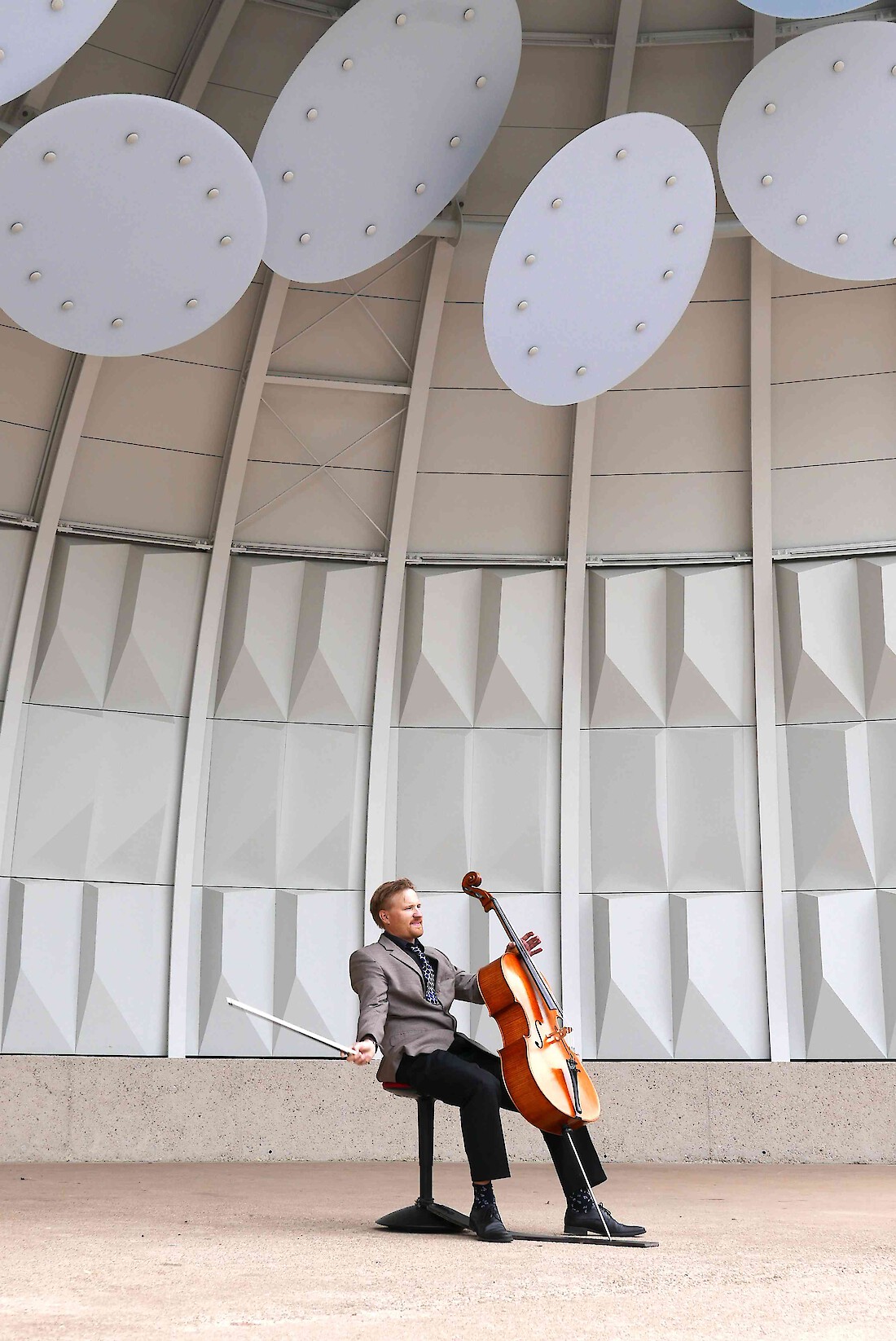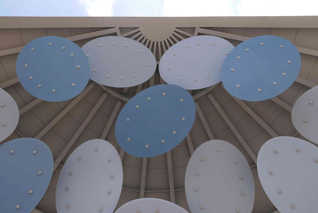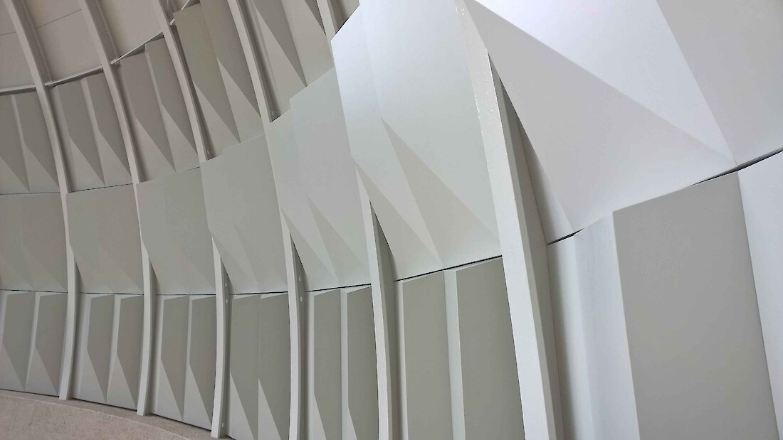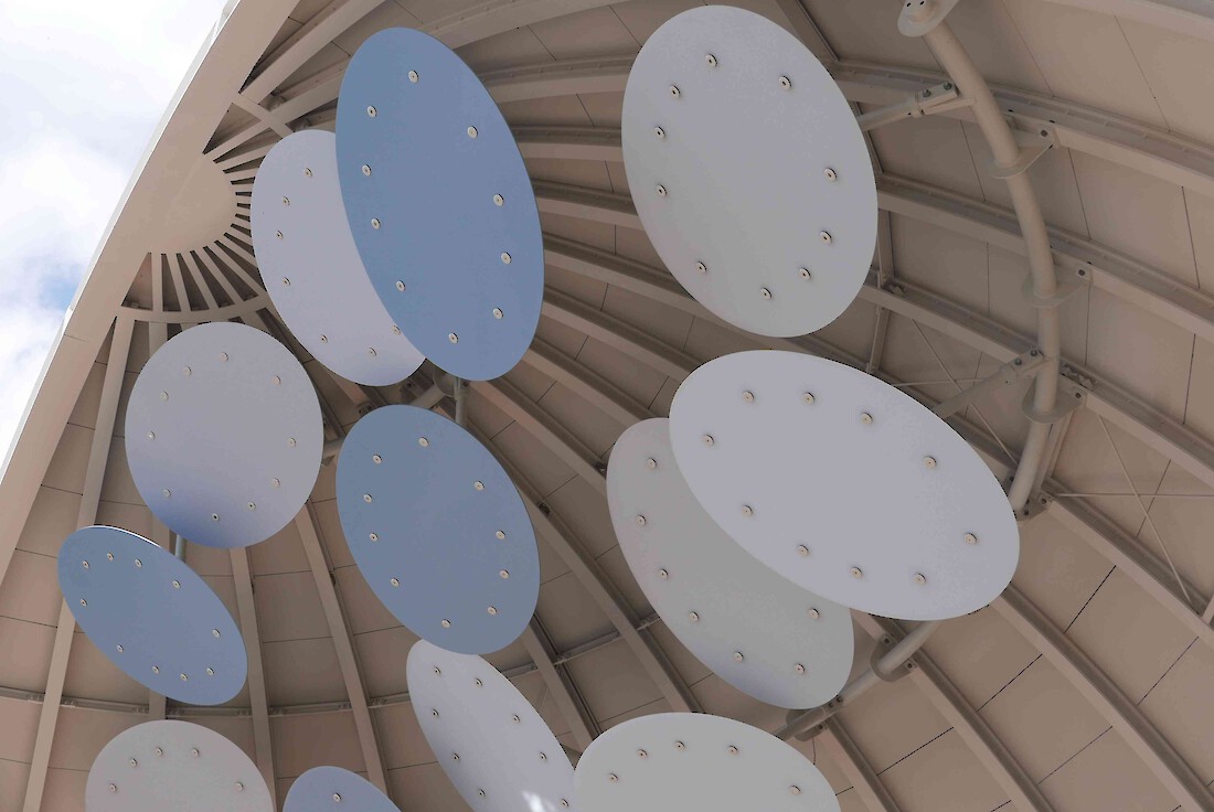 Der Sockelbereich erhält zwischen den vertikalen Stahlträgen bis in 4m Höhe innenseitig eine Verkleidung aus Holz-Elementen, sogenannte Kassetten, die aus Sperrholzplatten zusammengesetzt werden. Die Kassetten besitzen eine asymetrisch verzogene pyramidale bzw. diamantartige Form, um die akustischen Wellen in unterschiedlichen Richtungen zu brechen. Geometrisch bedingt ist eine Fortsetzung der Kassetten bis in den Scheitelbereich der Viertelkugel nicht möglich. Daher sind in diesem verengenden Bereich frei angeordnete Elemente in Form von 12 Ellipsenplatten vorgesehen. Diese Ellipsen bestehen aus einem leichten Kunststoff-Material mit 10 mm Plattenstärke, das gute Schall-Reflexionseigenschaften besitzt. Die Befestigung aus Aluminiumstangen und -haltern erlaubt eine flexible Ausrichtung der Ellipsenplatten, um eine optimale Einstellung zu den erzielenden Reflexionseigenschaften zu ermöglichen. Je nach akustischem Befund kann die Position der Ellipsen nachträglich geändert werden. Gestalterisch soll der durchscheinende bzw. transluzente Effekt der Kunststoffplatten an ein Wolkenmotiv erinnern.