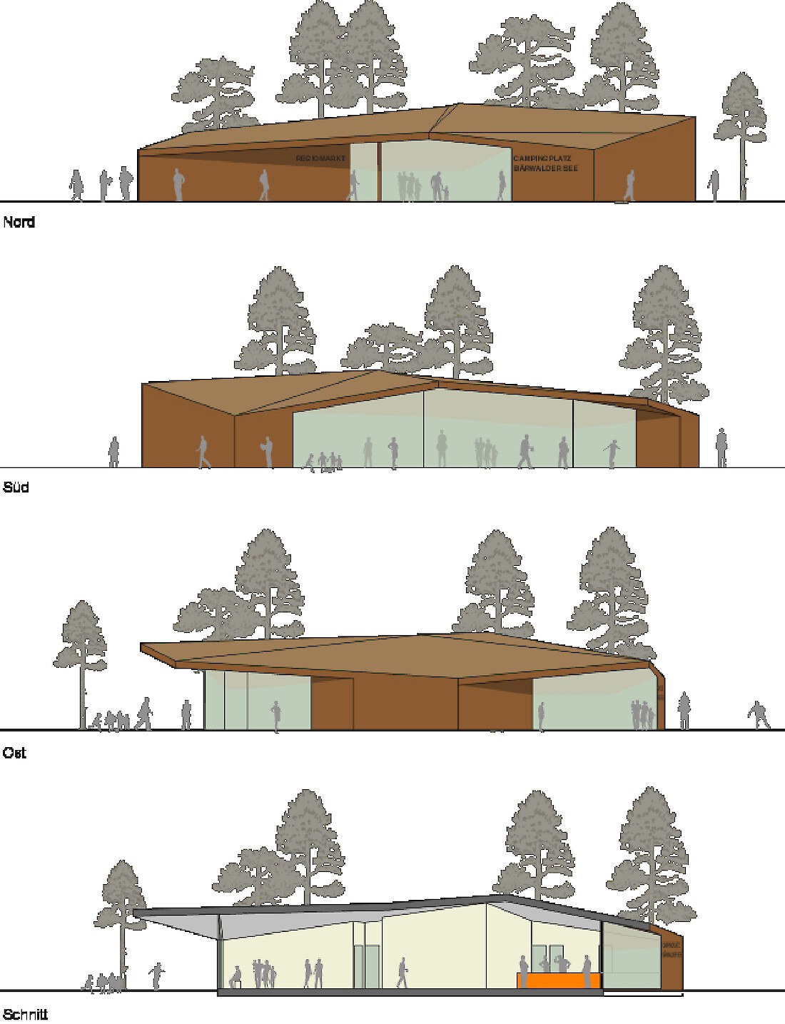 Ein Hauptweg bildet das Rückgrat des Campingplatzes und verbindet alle Funktionsbereiche. Über zum See führende Querwege gelangt man ins Innere der Anlage. Die Wege verlaufen nicht einfach geradeaus, sondern knicken immer wieder und verändern die Perspektive, fingerartig greifen sie in den Raum. Dieses Schema wird auch auf die Hochbauten übertragen: statt verstreuter Kleinbauten Zusammenfassung mehrere Funktionen zu kompakten, aber leicht erscheinenden Baukörpern, unter flach geneigtem Dach, polygonal und asymmetrisch im Grundriss, mit zeltähnlichem Charakter, aber mit robuster Haut.