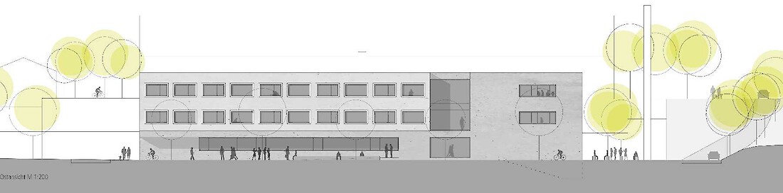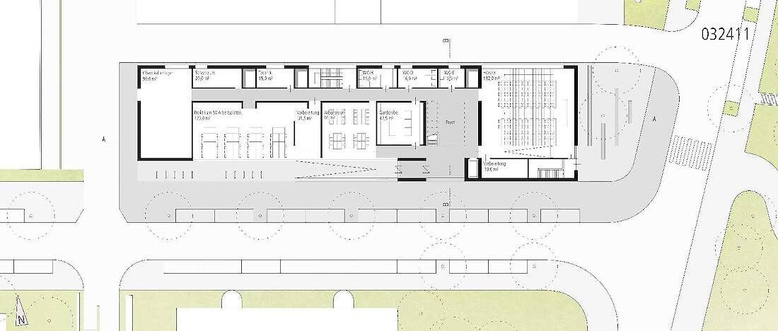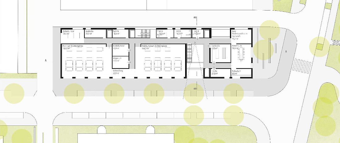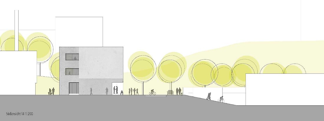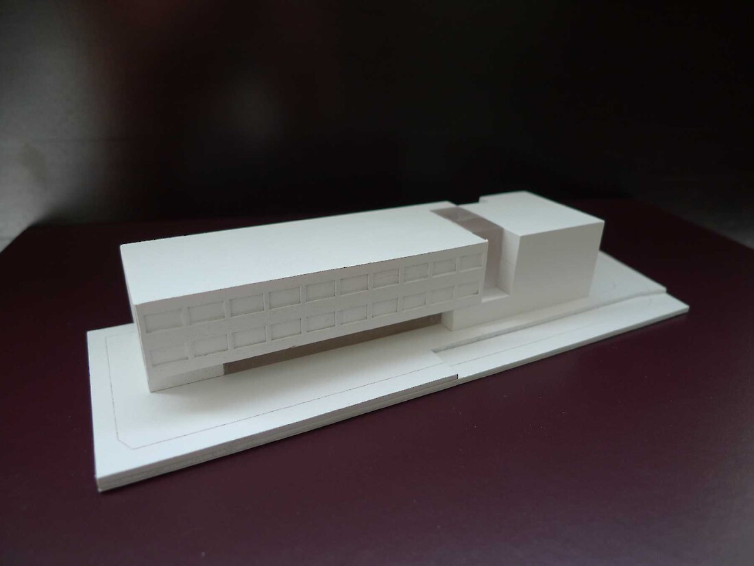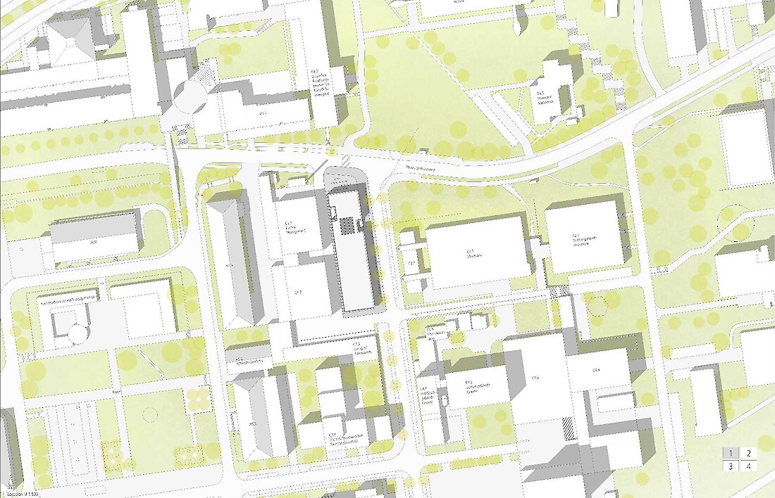 Die Platzierung des neuen Gebäudes folgt dem städtebaulichen Raster des Universitätscampus, der auf die orthogonale Strenge der ehemaligen Kasernenanlage basiert. Der aus der vorhandenen Parzellenfläche zwangsläufig zu entwickelnde quaderförmige Bau steht jedoch am Rande des historischen Campusgebietes, so dass sich Übergänge von Dichte zu Lockerheit, von Enge zu Weite ergeben. Aus diesen Rahmenbedingungen lassen sich folgende Konsequenzen für die Formfindung des Baukörpers ableiten. Zum einen gilt es die kleinteilige Körnung der Umgebung zu respektieren und einen Stadtbaustein in das Bestehende einzufügen. Zum anderen ist auf den Übergang in die offenere, landschaftsähnliche Situation zu reagieren. Als Strategie wird die Methode der Substraktion gewählt. Dies erfolgt durch das Herausschneiden bestimmter Bereiche aus dem Baukörper – einem Mittel, das einer bildhauerischen Tätigkeit bei Herstellung einer Skulptur gleichkommt.