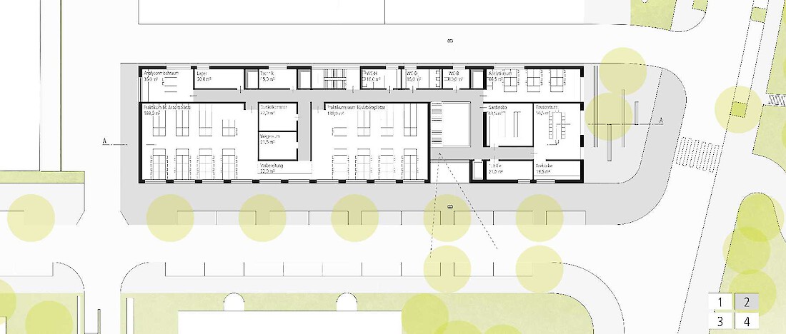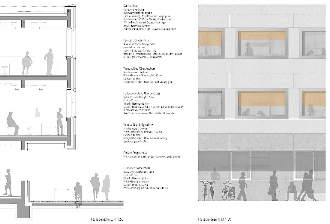 Die aus dem Städtebau abgeleitete Formfindung entspricht der inneren Funktionsgliederung. Im längeren Gebäuderiegel sind in allen Geschossen die Labor- und Praktikumsräume untergebracht, während der kürzere Kopfteil den erdgeschossigen Hörsaal sowie in den Obergeschossigen Gemeinschafts- und Sozialräume aufnimmt. Das großzügige, dreigeschossige Foyer fungiert als Verbindungsglied zwischen den einzelnen Nutzungsbereichen, welches eine optimale Orientierung ermöglicht und die Kommunikation über die Geschosse hinweg fördet. Eine breite einläufige Foyertreppe und die umlaufende Galerie erlauben weite Ausblicke, fokussiert durch die Gebäudefuge, auf das städtebauliche Panoptikum vom herausragenden Meisterwerk der Mensa bis hinunter auf die Reihung von Einzelbauten entlang des Stuhlsatzenweges. Die vom Foyer ausgehenden Flure gliedern das Gebäude in einen ungleich tiefen Zweibund, einer schmalen, rückwärtigen Schiene mit Service- und Technikräumen sowie einem grossen Riegel, der die tiefen Labor- und Praktikumsräume aufnimmt. Der Hörsaal liegt am Foyer unmittelbar am Haupteingang. Garderoben und Spinde befinden sich zur Erleichterung der Arbeitsabläufe in eigenen Räumen, die in zentraler Lage auf jedem Geschoss verteilt sind.