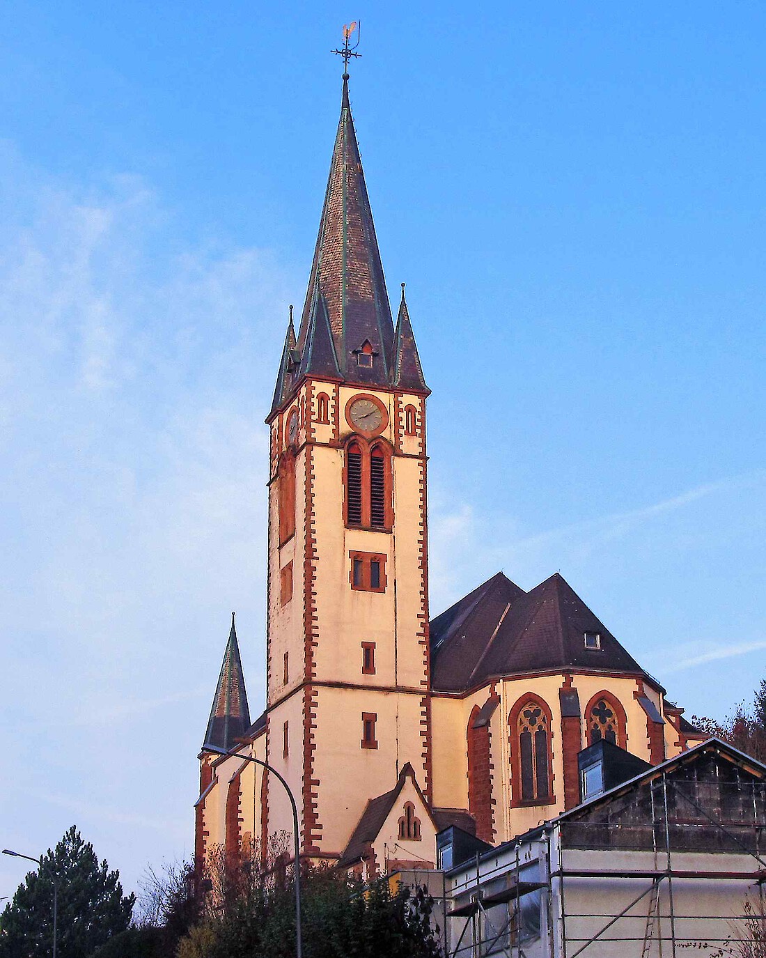 Die denkmalgeschützte Pfarrkirche Maria Himmelfahrt wurde 1907 vom Architekten Wilhelm Hector im neugotischen Stil erbaut. Ziel der Sanierungsplanung mit vorheriger umfangreicher Schadenskartierung war die Wiederherstellung des Kirchturms in der historisch korrekten Materialität von Fassade und Dach. Dazu gehörte auch die Erneuerung der putzsichtigen Fassade mit NHL-Putz. Die farbliche Angleichung an das historische Vorbild erfolgte durch Beimischung von Rheinsand. In diesem Zusammenhang wurden sämtliche Gliederungselemente aus Sandstein umfassend saniert und der von Schädlingsbefall betroffene Dachstuhl ertüchtigt. Die ursprüngliche Schiefereindeckung des Daches wurde mit aufwendigen Bleiverkleidungen und Einfassungen wiederhergestellt. Sämtliche Maßnahmen wurden intensiv mit der Denkmalpflege abgestimmt.