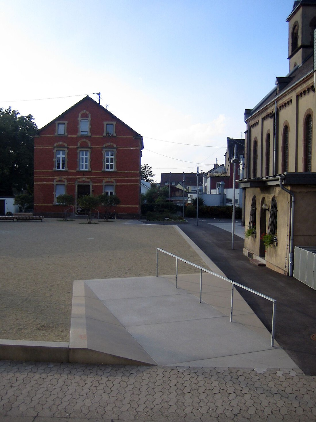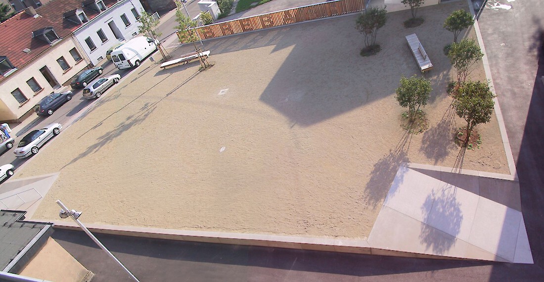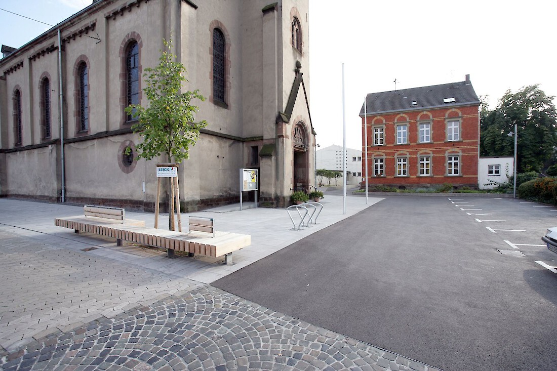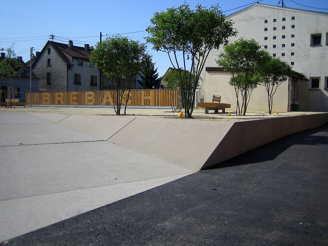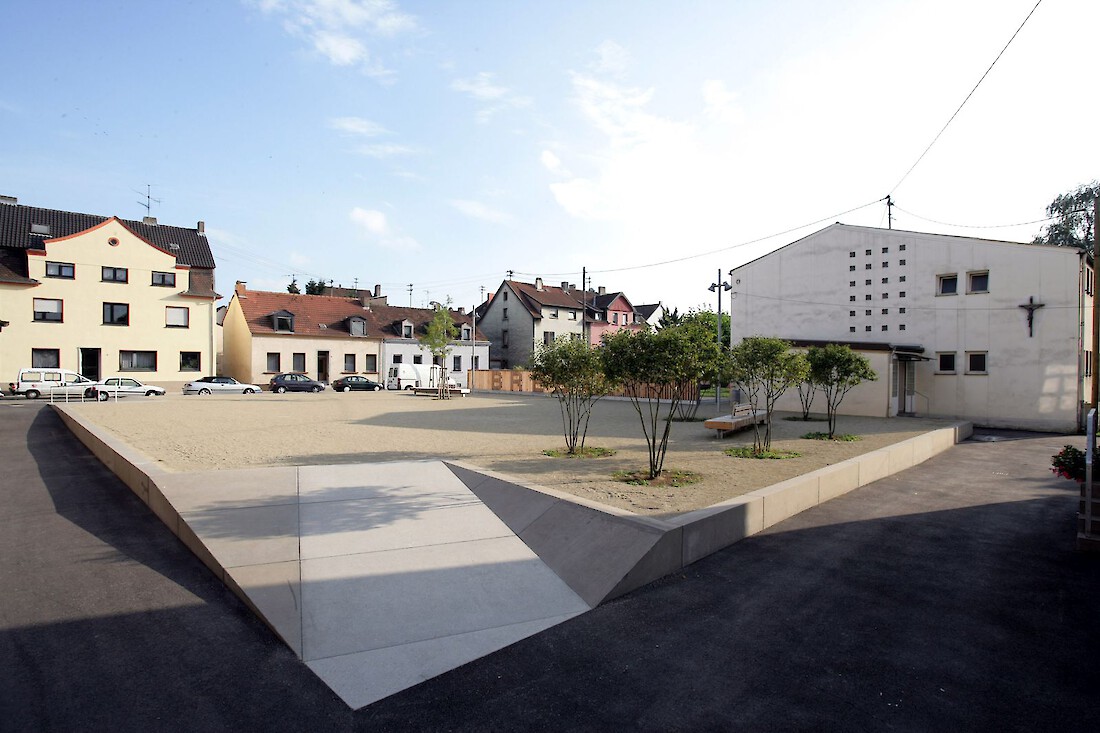 In Brebach einem Stadtteil von Saarbrücken wurde im Rahmen des Projektes "soziale Stadt" das Umfeld der Kirche neugestaltet und auf dem Gelände des ehemaligen, nicht mehr genutzten Pfarrgartens ein neuer Quatiersplatz geschaffen. Dies ist für Brebach von besonderer Bedeutung, da es bislang keinen öffentlichen Platz im Ort gab. Günstige Vorraussetzung bietet die Lage im Schnittpunkt wichtiger Straßen und öffentlicher Einrichtungen, nämlich zwischen Kindergarten, der katholischen Kirche, Pfarrheim und Pfarrhaus. Das Areal ist zur Kirchstraße hin geöffnet und bindet direkt an die Saarbrücker Straße an. Der Entwurf gliedert die Gesamtfläche in drei, in ihrer Funktion unterschiedlichen Bereiche: der Bereich unmittelbar um die Kirche, der Raum zwischen Kircheneingang und Pfarrhaus, der sogenannte kleine Kirchplatz, der als Parklatz genutzt wird und der große Kirchplatz zwischen Kirche und Kindergarten/ Gemeindesaal, der ca. 20-40 cm erhöht als Quatiers- und Festplatz dient.