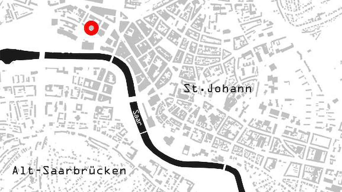 Verwaltungsgebäude der Ruhrkohle AG (RAG) / ehem. Saabergewerke, Hafenstr. 25, St.Johann, erbaut 1977; Architektur: Fachabteilung Hochbau der Saarbergwerke (Huber, Sarner, Rausendorff, Lichtenhagen). Kunst am Bau: Paul Schneider. Grafisches Leitsystem: Diethard Adt. Aktualisierung 2018: Gebäude wurde 2017 abgebrochen