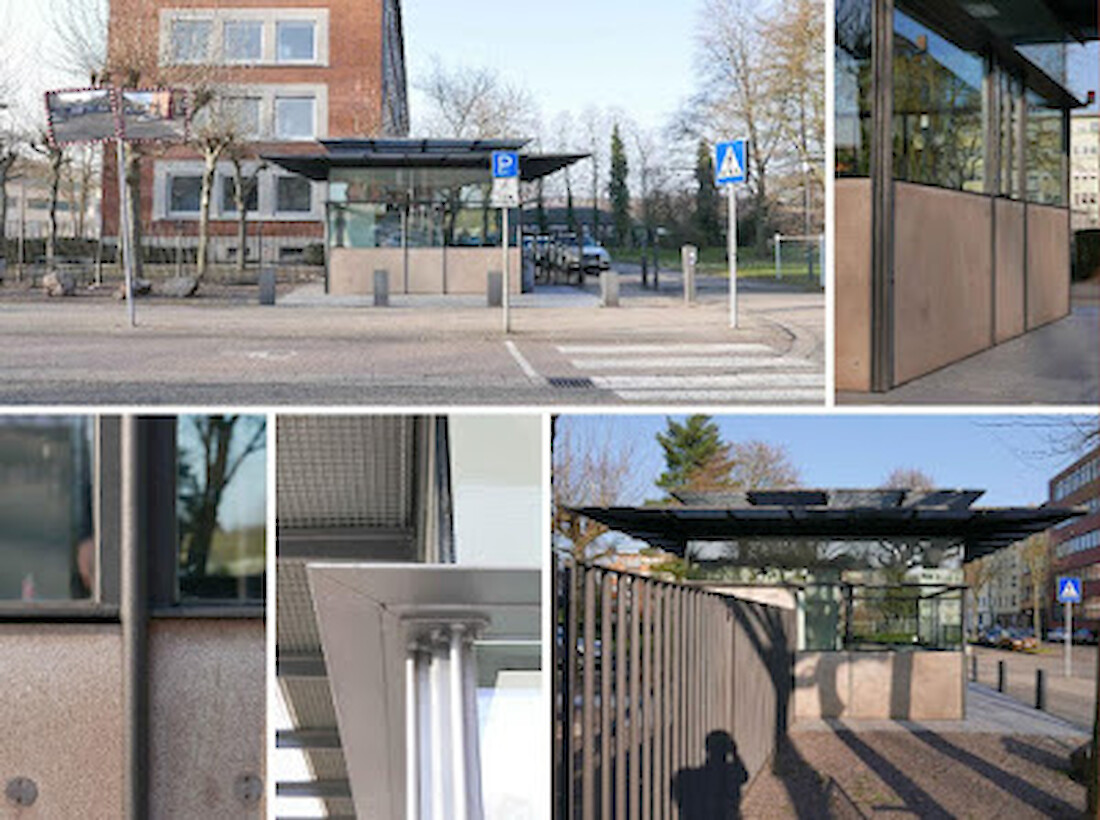 Dieses Pförtnerhäuschen zählt zum Bautypus der Kleinbauten. Sie sind nicht bloß maßstäbliche Verkleinerungen normaler Architektur, vielmehr sind Kleinbauten eine Zweckarchitektur, die für bestimmte Bedürfnisse errichtet wurde, meistens monofunktionale Nutzung, jedoch nicht für Wohnzwecke. Sie zeigen oft eigenständige architektonische Lösungen in Kombination mit Zitaten aus der Alltagsarchitektur. So auch bei diesem außergewöhnlichen Kleinbau, der durch eine raffinierte Statik in Form einer zentralen pilzförmigen Stütze auffällt. Diese trägt die kompletten Dachlasten, so dass in der Außenhülle keine tragenden Profile notwendig werden. Auf diese Weise konnte eine äußerst filigrane Stahl-Glas-Sandstein-Fassade konstruiert werden, die durch feine Details wie schlanke Profile und Edelstahl-Schraubköpfe besticht.