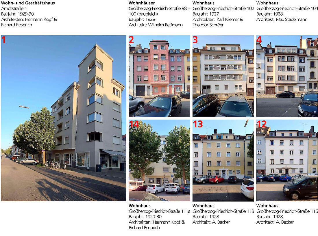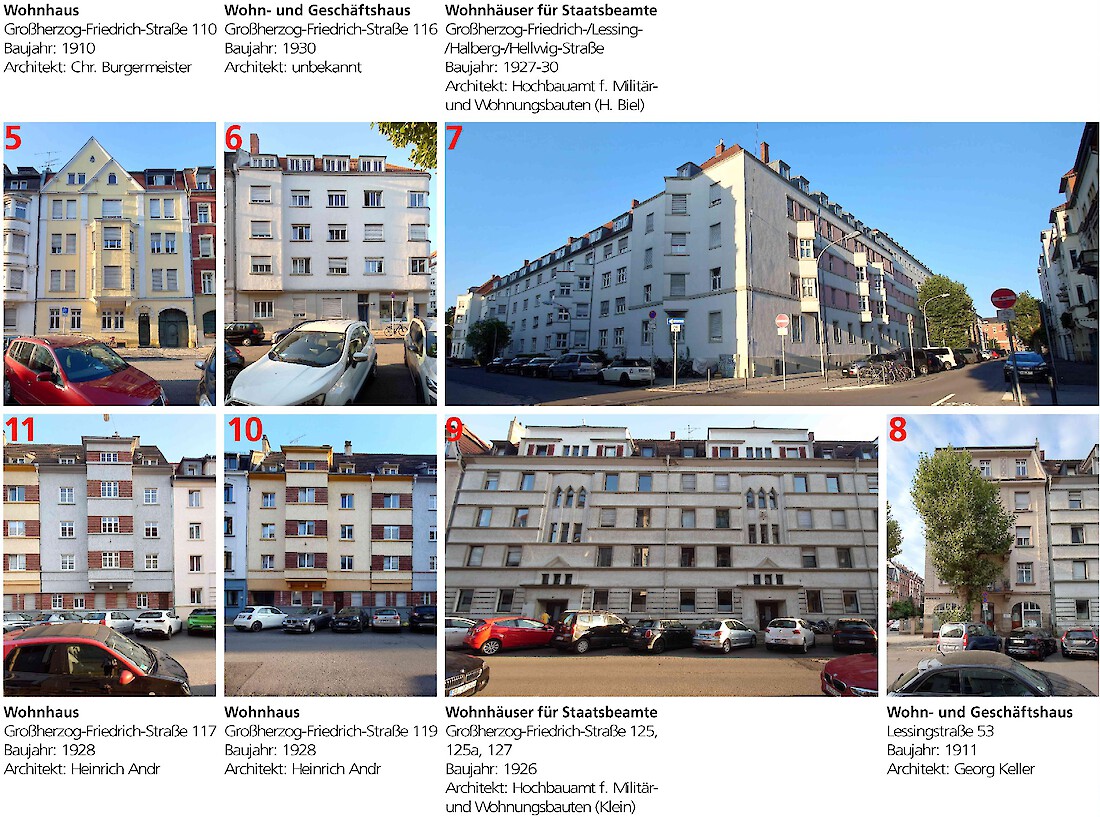 Der Staat war ein wichtiger Vorreiter bei der Umsetzung dieser Prinzipien. Ein herausragendes Beispiel ist der Baublock für Staatsbedienstete an der Großherzog-Friedrich-/Halberg-/Hellwig- und Lessingstraße, der 1929 unter dem Mandat der Völkerbundregierung durch das Hochbauamt für Militär und Wohnungsbauten errichtet wurde. Die Häuser Großherzog-Friedrich-Straße 125/125a/127 aus dem Jahr 1927 stammen ebenfalls vom gleichen Amt. Der staatliche Wohnungsbau beeinflusste auch private Bauherren, die ihre Bauten nach ähnlichen Standards der Reformarchitektur gestalteten, gut zu erkennen an den Häusern mit den Nummern 98, 100 sowie 113 bis 119.