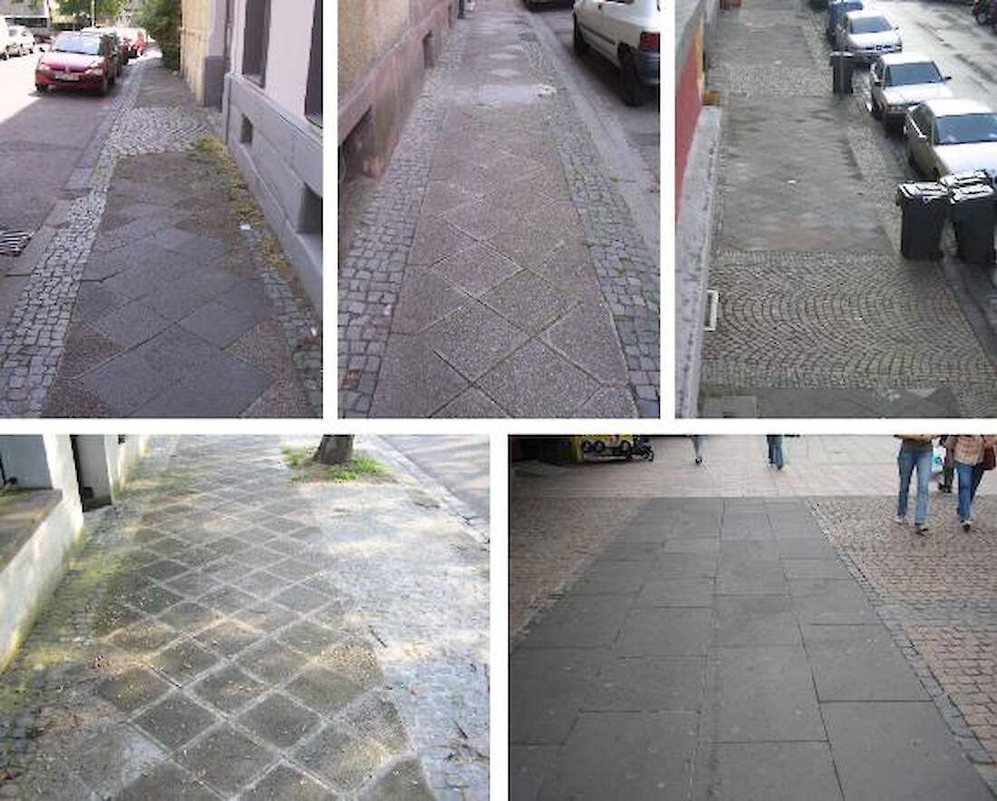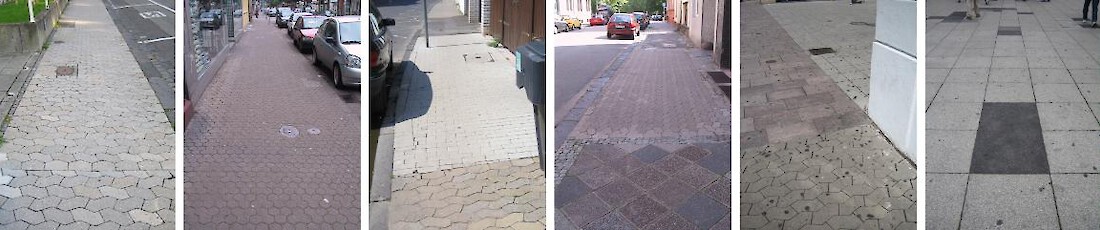 Das Auffälligste an den Saarbrücker Gehsteigen ist das Fehlen eines Gestaltungskonzeptes. Alle paar Meter wechseln die Pflasterformate und Materialien: Betonplatten im Format 30x30cm werden abgelöst durch kleinformatiges Betonplaster in der Form eines Parallelogramms, SF-Pflaster genannt, dazwischen Asfalt und allerlei Betonsteinvarianten von Rechteckform über Sechseckform (Bienenwabenmuster) bis zu Quadratform (z.B. entlang der Stadtbahntrasse). Zuweilen liegen sechs verschiedene Formate auf engstem Raum beieinander, so dass schnell der Eindruck einer Baumarkt-Musterschau aufkommt. In Saarbrücken findet die Auswahl entweder à la mode statt (wie etwa in der Bahnhofstrasse und um das Rathauscarré herum) oder - wohl häufiger - nach pragramatischen Gesichtspunkten. Andere Städte besitzen eine Gestaltungssatzung, die Mindeststandards für den öffentlichen Raum und für die Gehsteigpflasterung festlegt. Auch hier kennt man einen traditionellen Belagstypus, der sich be-währt hat und als Saarbrücker Muster bekannt ist: Ein Band aus diagonal verlegten Quadratbetonplatten mit einem Abschluss in der Form von „Bischofsmützen”und jeweils seitlich Streifen mit Basalt-Kleinmosaik, die ein leichtes Anpassen an Haussockel, Lichtschächten usw. ermöglichen. Im besten Fall - die Modernisierungswut überstanden und daher selten anzutreffen - gibt es noch einen Bordstein aus dunklem Basalt oder hellem Granit. Vielleicht Anregung für die Bauverwaltung, sich bei der Neuanlage oder Reparatur von Gehsteigen öfters an die „gute Form” zu erinnern.