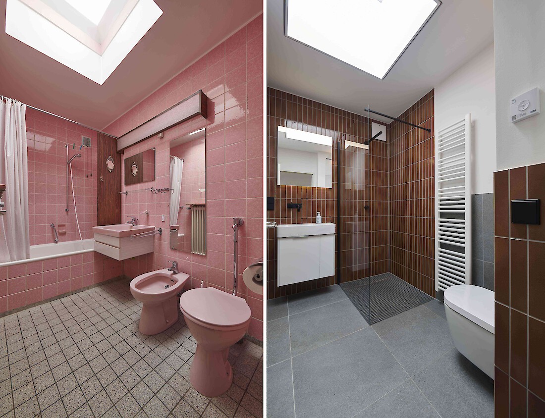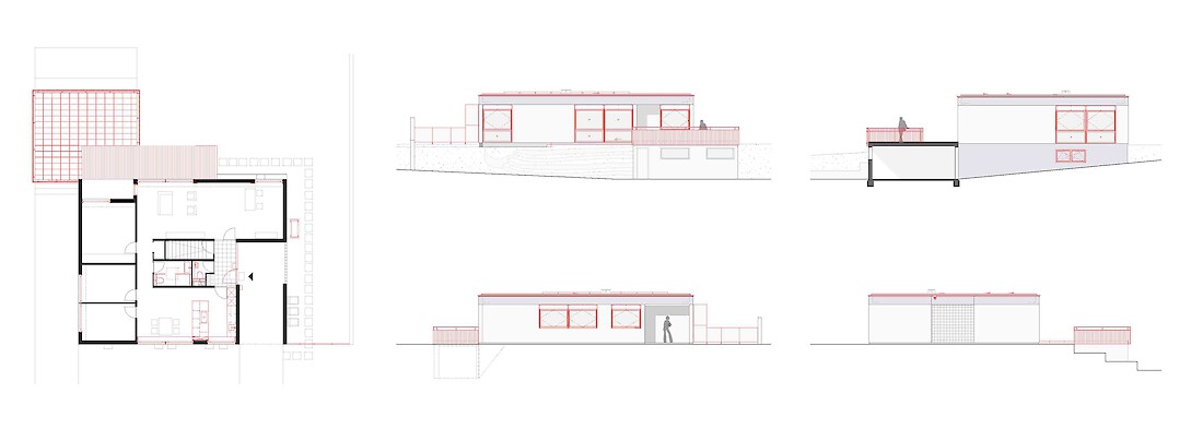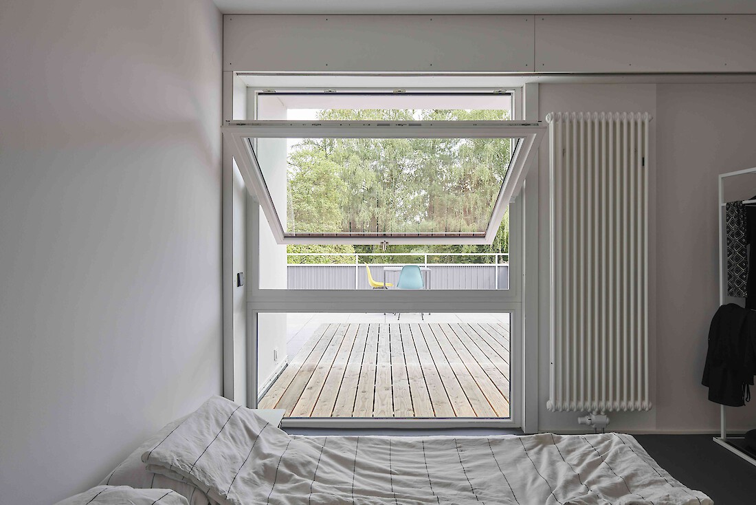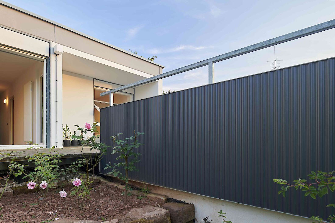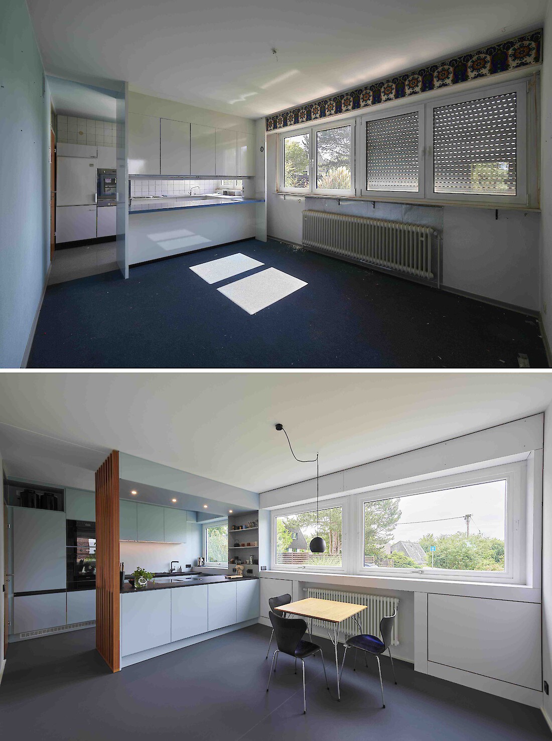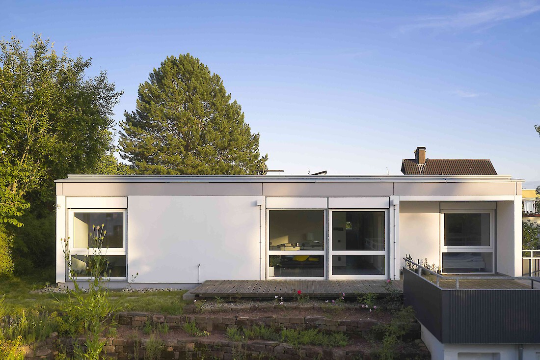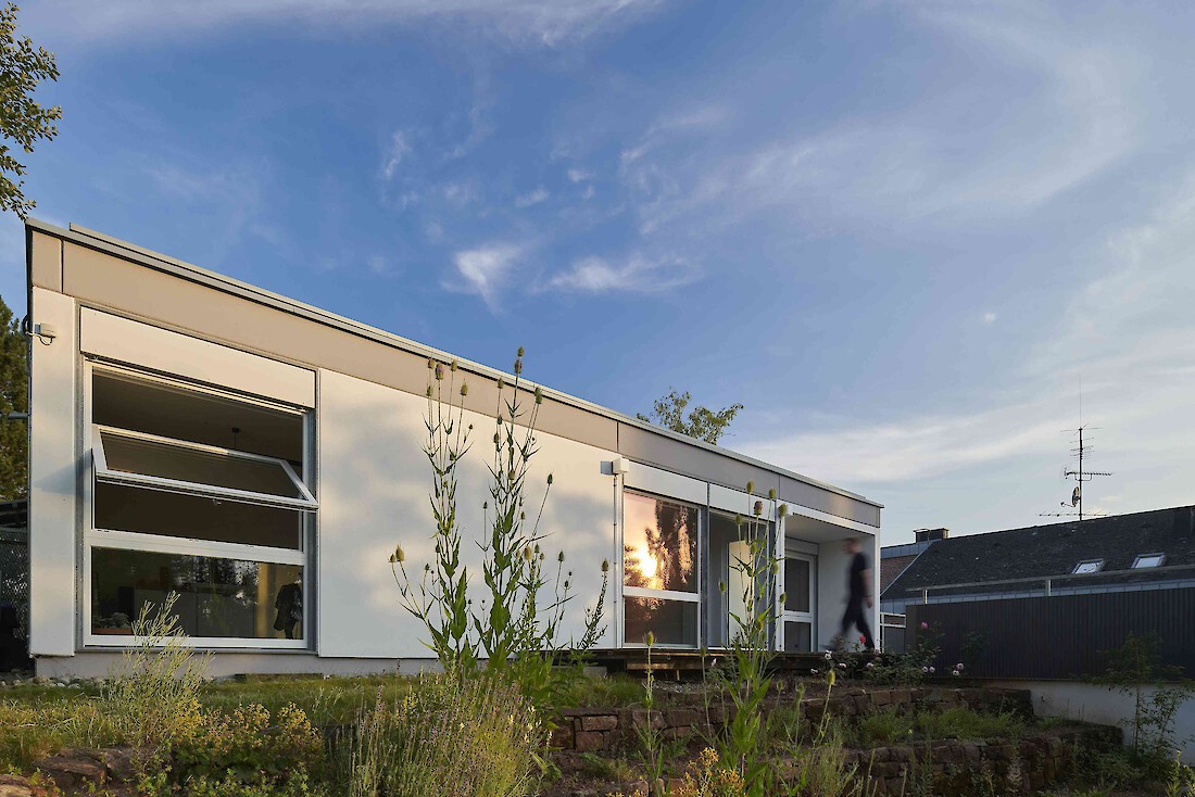 Die Herausforderung bestand darin, das Haus aus dem Jahr 1965 mit 120 m2 Wohnfläche energetisch zu sanieren und zeitgemäß zu modernisieren, ohne den besonderen Charakter der Architektur, der sich durch die Ablesbarkeit der Konstruktion auszeichnet, zu beschädigen. Eine Außendämmung, die die feine Gliederung und Fugenteilung der Fassade zerstört hätte, kam daher nicht in Frage. Die Plattenbauweise sollte sichtbar, die Geschichte des Bauwerks erhalten bleiben. Um zeitgemäße und nachhaltige Wohnvorstellungen zu erreichen, wurden stattdessen bauliche Verbesserungen wie eine Flachdachdämmung, neue Fenster mit Dreifachverglasung und eine Innendämmung an kritischen Stellen mit optimierter Anlagentechnik aus Luftwärmepumpe, für Niedrigtemperatur ausgelegte Heizkörper sowie einer PV-Anlage auf dem Dach kombiniert.