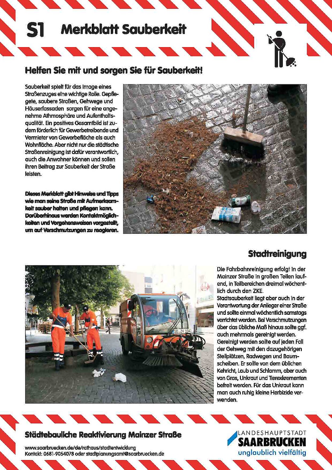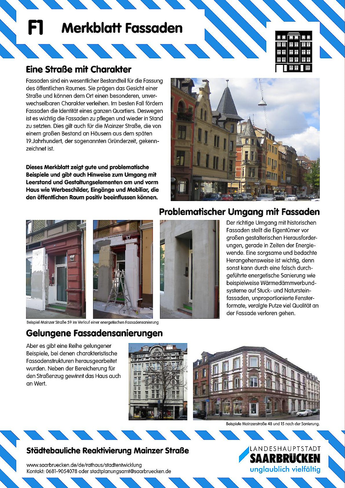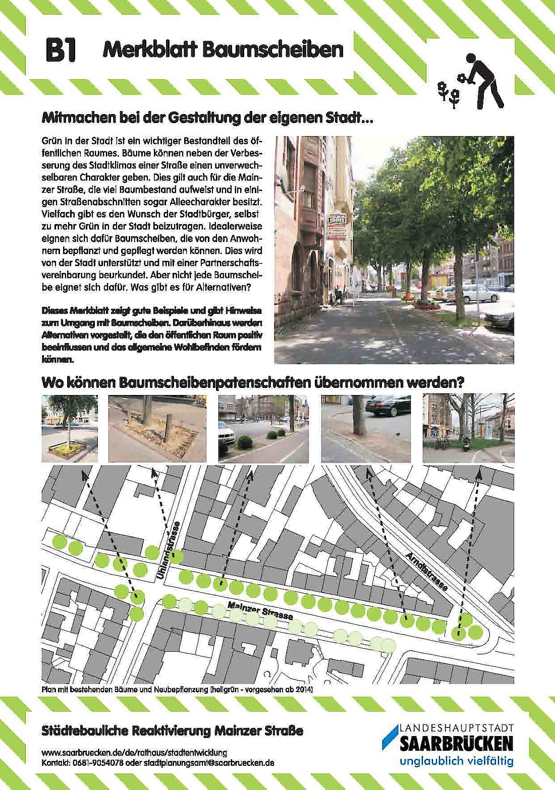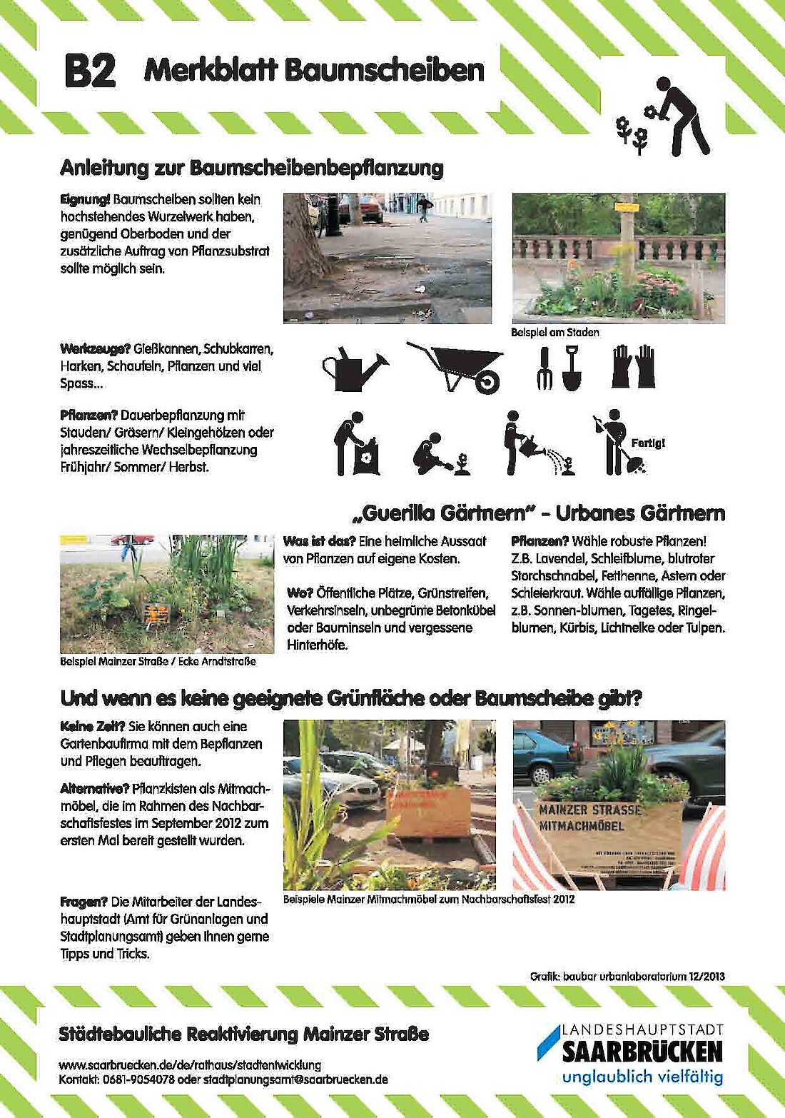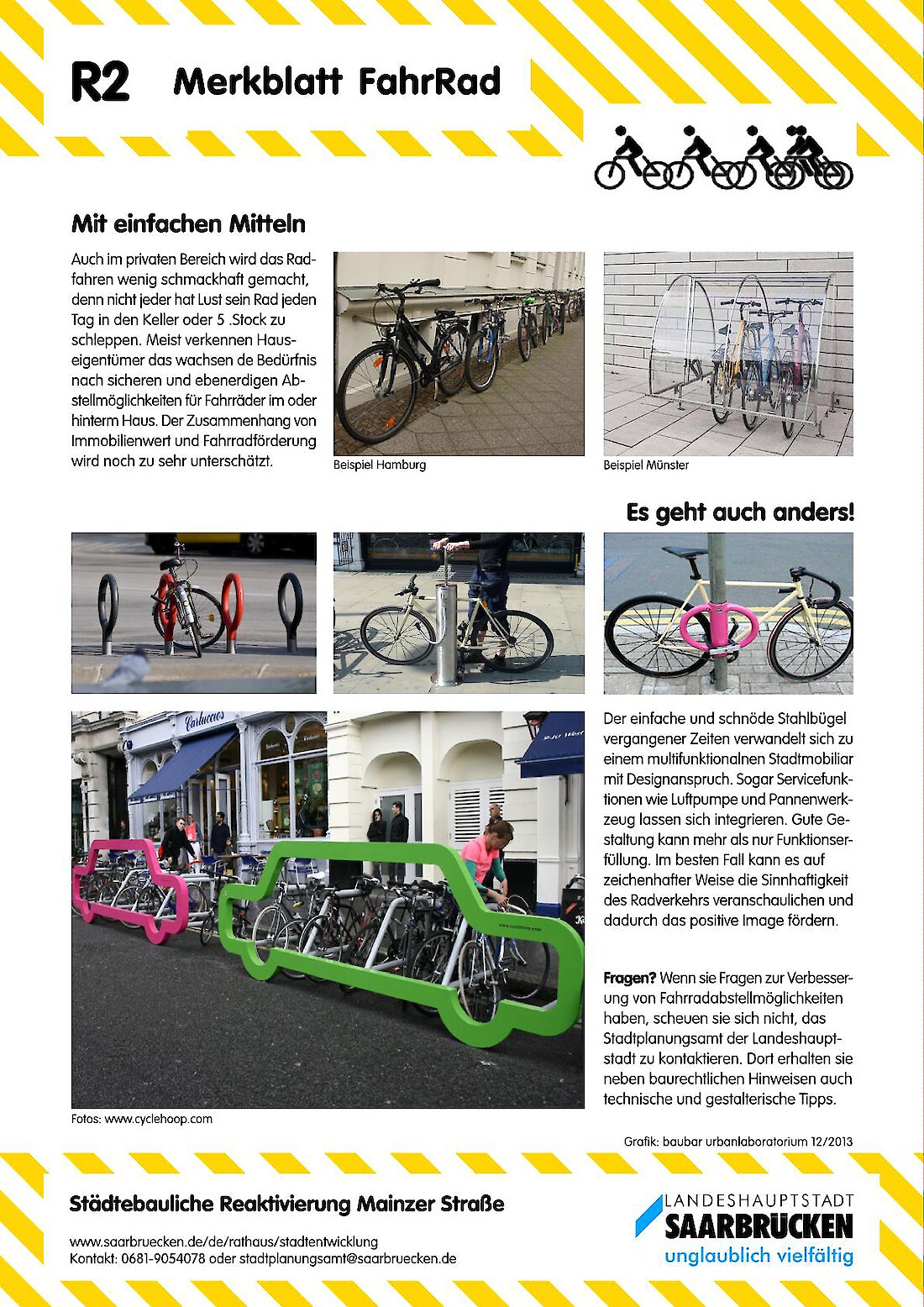 Mitmachen bei der Gestaltung der eigenen Stadt...im Rahmen des, vom Bundesinstitut für Bau-, Stadt- und Raumforschung (BBSR) geförderten ExWoSt-Projektes (Experimenteller Wohnungs und Städtebau) "städtebauliche Reaktivierung Mainzer Straße" haben wir in Zusammenarbeit mit dem Saarbrücker Stadtplanungsamtes und dem Zentralen Kommunalen Entsorgungsbetrieb ZKE exemplarische Merkblätter entwickelt, die zur Aufwertung des öffentlichen Raums animieren sollen. Die Merkblätter zeigen gute Beispiele aus den Bereichen Fassadengestaltung, Fahrradnutzung, urbanes Gärtnern und Sauberkeit. Sie geben Tipps, wie der öffentliche Raum positiv beeinflusst werden kann, um das allgemeine Wohlbefinden und die Aufenthaltsqualität zu fördern.