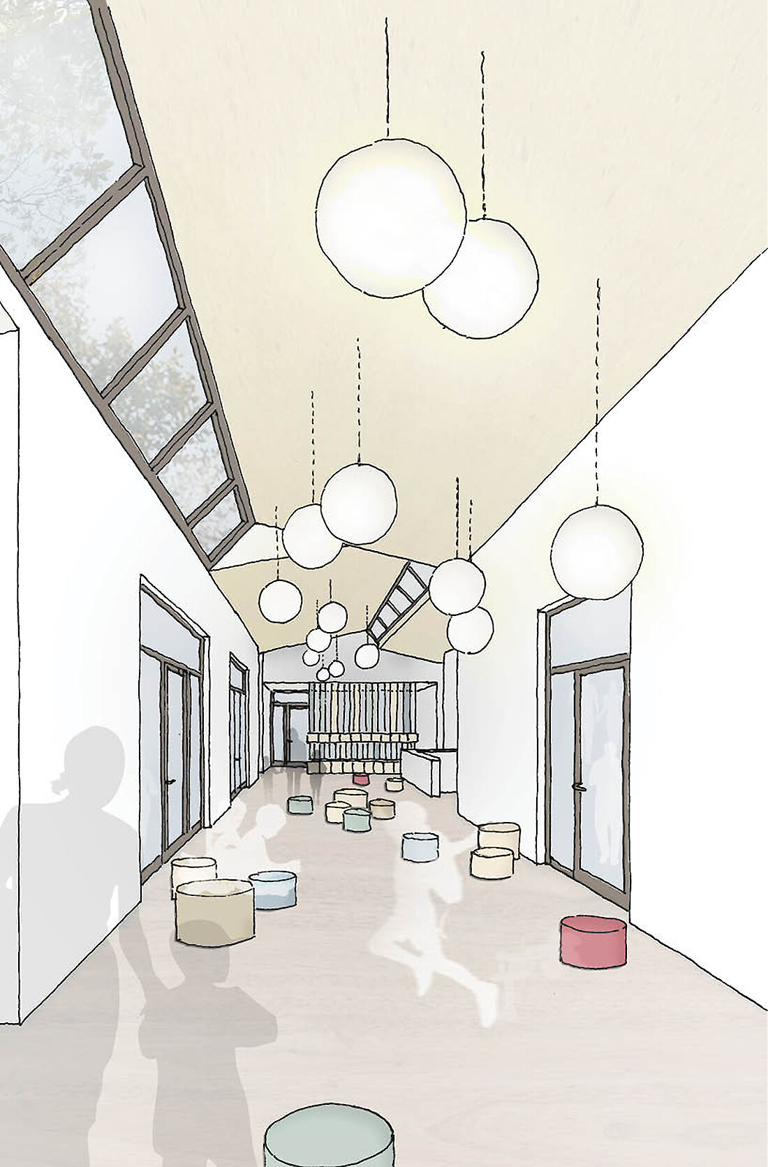 Genau so ein Bild könnte der langgezogene Baukörper der sechsgruppigen KiTa, der parallel zur Gisorsstraße angeordnet ist, vermitteln. Über eine Rampen-Treppen-Anlage geht man an Bord. Um bei der Schiffsassoziation zu bleiben, bildet der Mittelteil den Rumpf, in dem alle gemeinschaftlichen Funktionen, vom Mehrzweckraum über die Kindermensa bis zum Begegnungsraum, zu finden sind. Die jeweiligen Enden des Schiffskörpers sind den Kindern vorbehalten: Im Backbord der Krippenteil, im Steuerbord, über zwei Geschosse organisiert, der Ü3-Bereich. Das besondere Kennzeichen dieser Bereiche ist, dass jeweils zwei Gruppen eine bauliche Einheit bilden, die für sich autark funktioniert und interne Rundläufe zulässt, ohne die anderen Bereiche zu stören. Jede dieser Einheiten hat über die Matsch-Kleider-Schleuse einen kontrollierten eigenen Ausgang ins Freie. Daneben besitzen vier Gruppenräume einen direkten Zugang in den Garten. Dabei schafft das verlängerte Dach eine wettergeschützte Vorzone zum Außenraum.