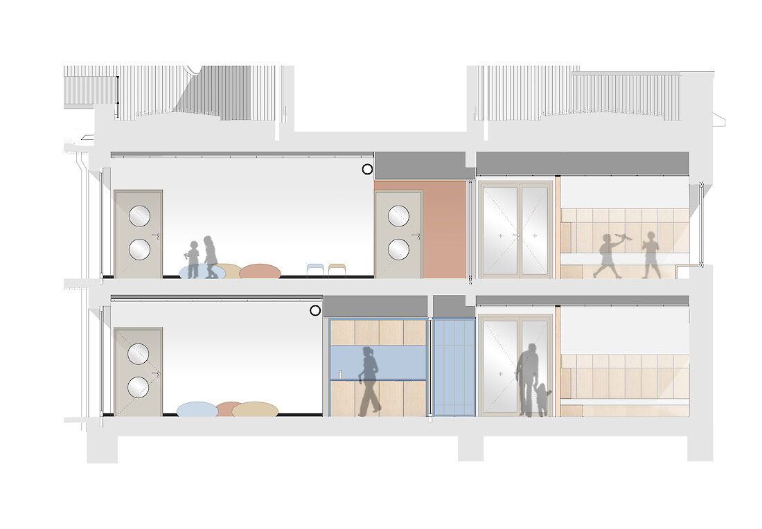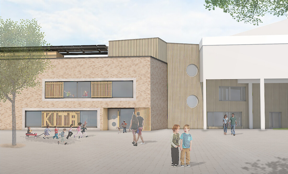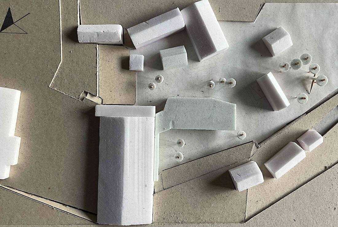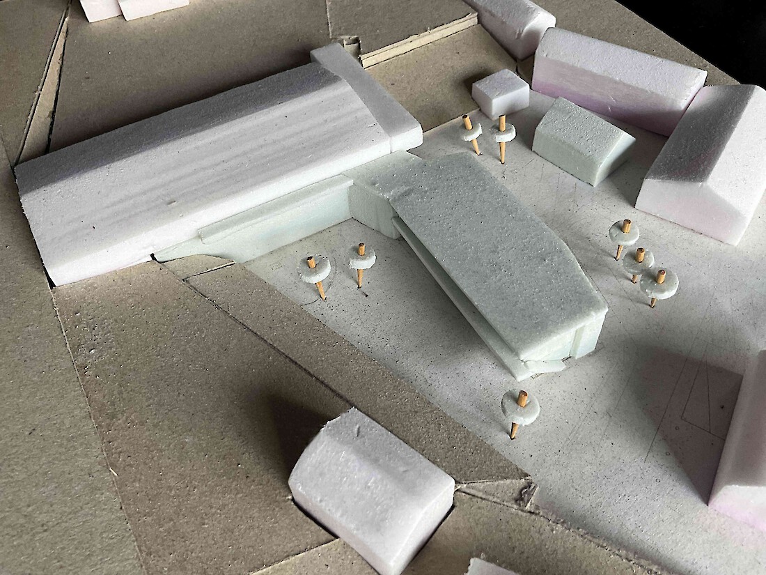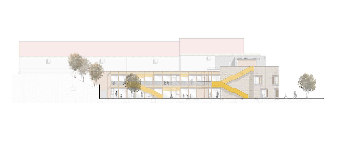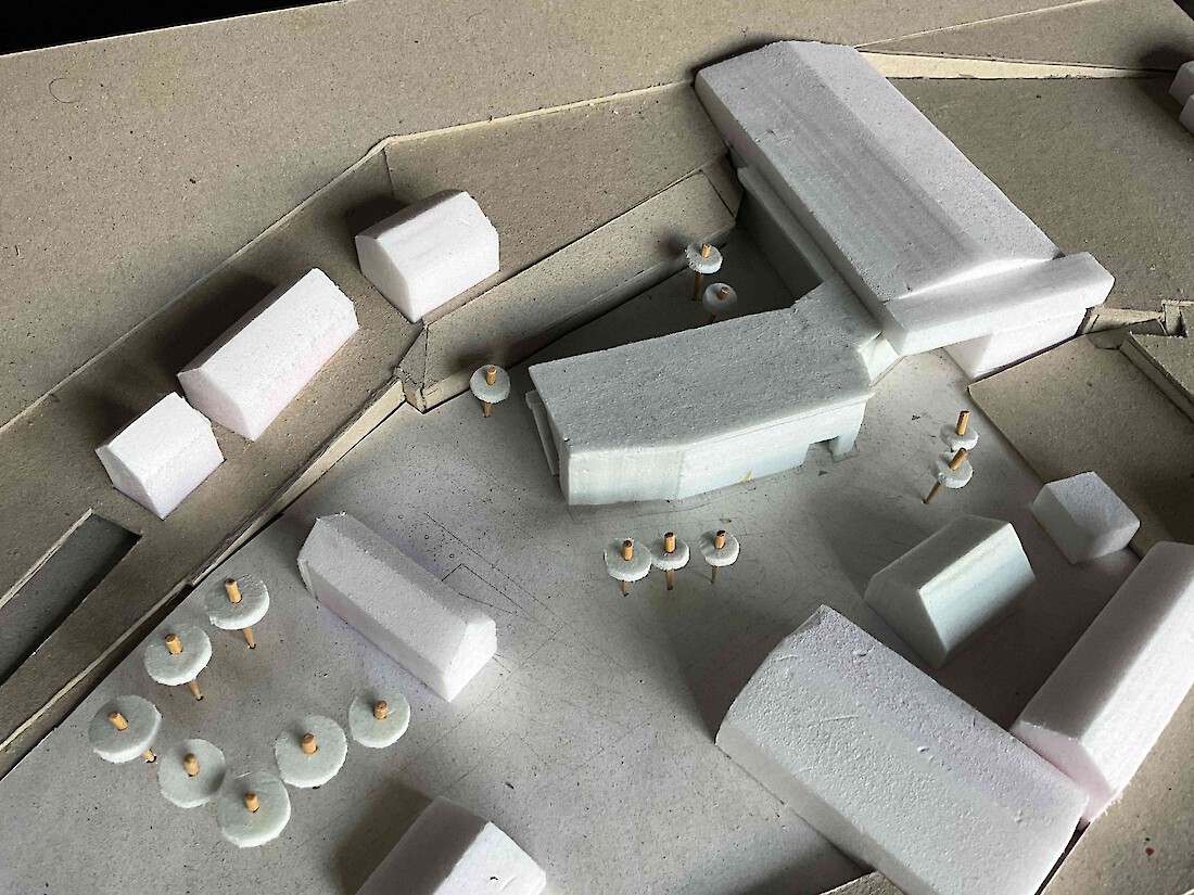Der dritte Anlauf muss klappen: nachdem unser erstes Projekt „boxoffice“ aus dem Jahr 2002 und der im Jahr 2009 durchgeführte Wettbewerb des Dorfgemeinschaftshauses (Sieger: dreibund architekten) unrealisiert blieben, hat die Gemeinde Spiesen-Elversberg die Gunst der Stunde genutzt, die Standortentscheidung des Neubauprojektes eines Kindergartens von der Pfarrkirche St.Ludwig infolge von Grundstücksschwierigkeiten zum Festplatz unterhalb des „Edeka“-Marktes abzuändern, um endlich die städtebaulichen Probleme in diesem Bereich zu lösen. Dabei haben wir das unglaubliche Glück (nach einem gewonnenen VgV-Verfahren) an der Heilung der „offenen Wunde“ im Ortskern von Spiesen mitzuwirken. Unser Entwurf bietet nun eine Chance, die städtebaulichen Defizite, die das aufgeständerte Marktgebäude hinterlassen hat, zu beheben. Der zweigeschossige Neubau ist für 5 Kindergarten- und 3 Krippengruppen mit einer Gesamtfläche von 2.210 qm ausgelegt. Um die Gebäudemasse ortsverträglich zu integrieren, wird ein Teilbereich des Kindergartens in den freien Luftraum unterhalb des bestehenden Einkaufsmarktes hinein geschoben. Auf diese Weise wird ein „verlorener“ Raum nicht nur einer Nutzung zugeführt, auch die Flächenversiegelung wird klimagerecht minimiert. Zugleich bietet der Raum im hinteren Bereich Platz für die Mitarbeiterautos. In anderer Richtung teilt der freistehende Flügel des Kindergartens die übergroße Platzfläche in zwei maßstabsgerechte Bereiche neu. Zwischen dem Kindergarten und dem Hang des Butterbergs entsteht ein geschützter Spielhof, während auf der Ostseite ein öffentlicher Raum für die Erschließung geschaffen wird. Das Gebäude selbst reagiert mit seinen Materialien auf die unterschiedlichen städtebaulichen Situationen: Zum öffentlichen Raum werden die Außenwände des freistehenden Flügels mit einer robusten Verblendung aus Klinkermauerwerk verkleidet. Die zum Spielhof orientierten Fassaden erhalten eine natürliche Holzverkleidung mit einer Laubengangkonstruktion davor, die ebenso aus Holz errichtet wird. Die funktionalen Fassadenflächen der Garagenbereiche werden mit einer vorgehängten Aluminium-Welle verkleidet. Die Dachfläche bietet zusätzlich ein Nutzungs-Angebot für die Kinder in Form eines Dachgartens mit intensiver Begrünung. Eine darüberliegende Plattform, bestückt mit PV-Modulen, dient als Rankhilfe und sorgt zugleich für eine natürliche Verschattung. Zusammen mit dem historischen „Haus Lion“ wird dieses neue Ensemble den sehr heterogenen Ortskern von Spiesen architektonisch und städtebaulich aufwerten.
