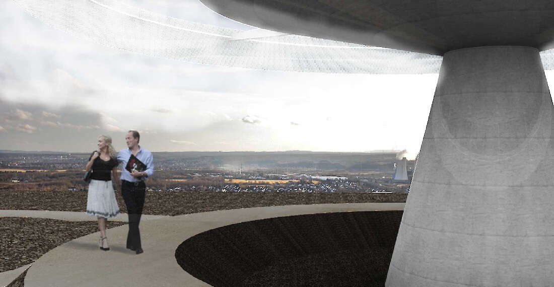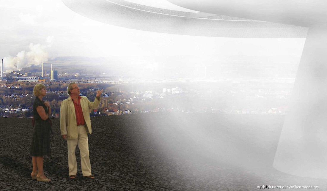 Ein Industrievulkan, eine Energiemaschine? Die Möglichkeiten, die dieses sich ständig verändernde Bild in sich trägt, sind zahlreich und sie stehen für die Chancen, die Abenteuer und freiwerdenden Energien, die jede Veränderung birgt. Die Wolkenmaschine steht an der Schwelle zwischen Vergangenheit und Zukunft: Ein grenzenloses Objekt, das die Wandlung vom traditionellen Industriestandort zur modernen europäischen Energieregion treffend beschreibt.