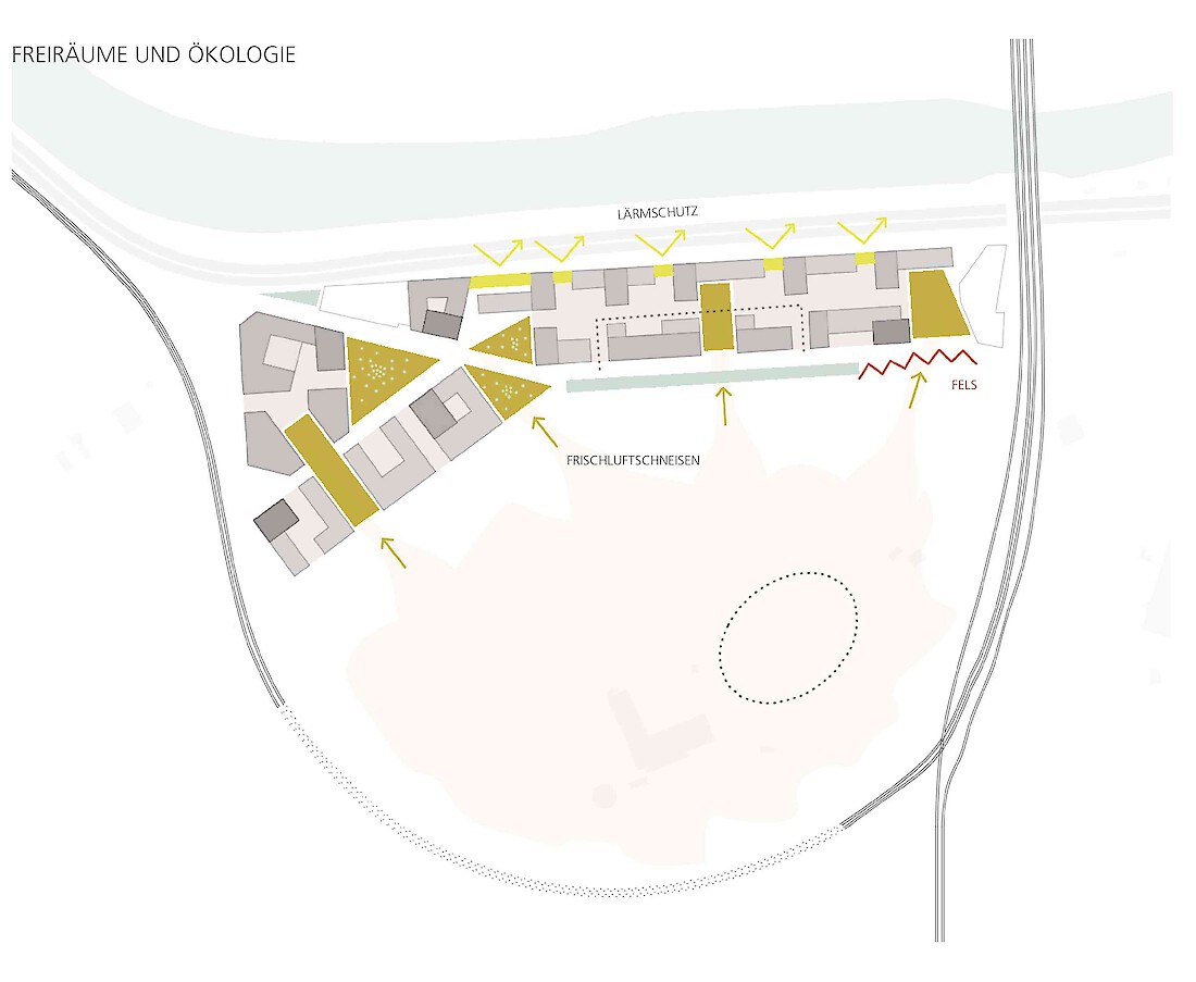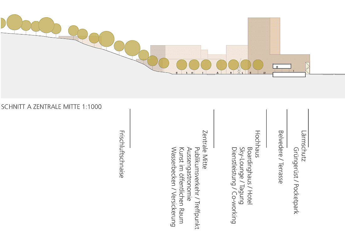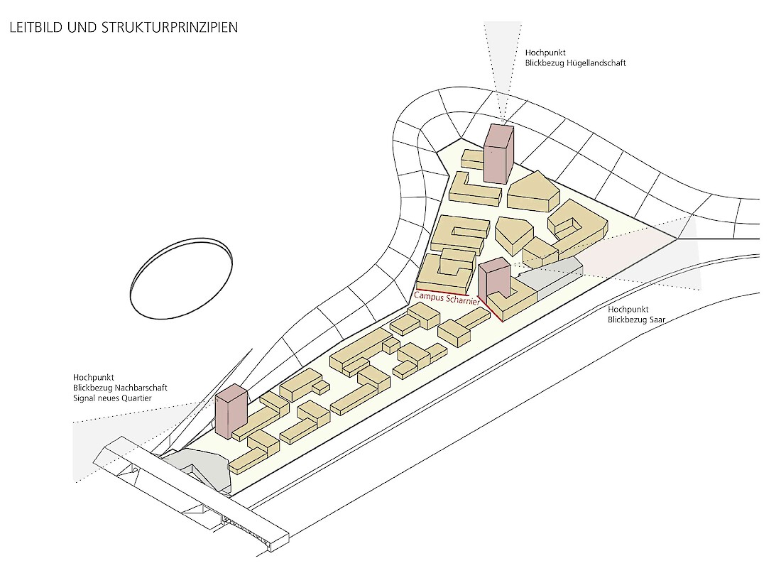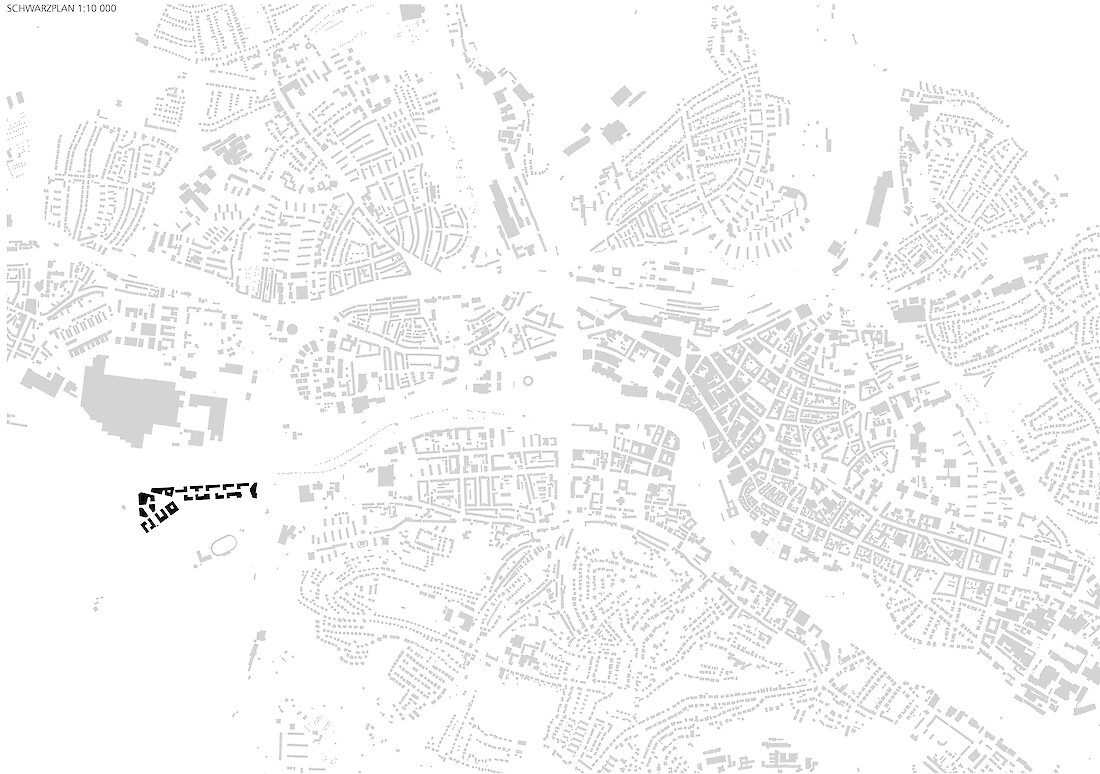 Die Besonderheit des ehemaligen Messeareals am Schanzenberg ist die Isoliertheit vom restlichen Stadtkörper, die von den künstlichen und natürlichen Barrieren wie Bahndamm, Autobahn und Topographie herrührt. Obwohl äusserst prominent gelegen - am westlichen Einfallstor der Stadt - ist sie eine Insel im Gefüge der Stadt. Erste Aufgabe einer städtebaulichen Lösung für das Areal muss es sein, dass neue Quartier in den Stadtkörper zu integrieren, mit den benachbarten Gebieten zu vernetzen, aber vor allem es für die Gesamtstadt sichtbar zu machen. Auf dem Schanzenbergareal soll eine urbane Überbauung von hoher Dichte und guter Qualität entstehen. Bemessen an der verfügbaren Grundfläche fordert das Programm in der Tat eine urbane Dichte. Zudem ist die Bebauung auf ein schmales Band beschränkt und nur durch das Nadelöhr eines kurzen Tunnels erreichbar. Also gilt es, aus dem Thema der Insellage heraus ein Quartier mit einer hohen eigenständigen Qualität zu entwickeln.