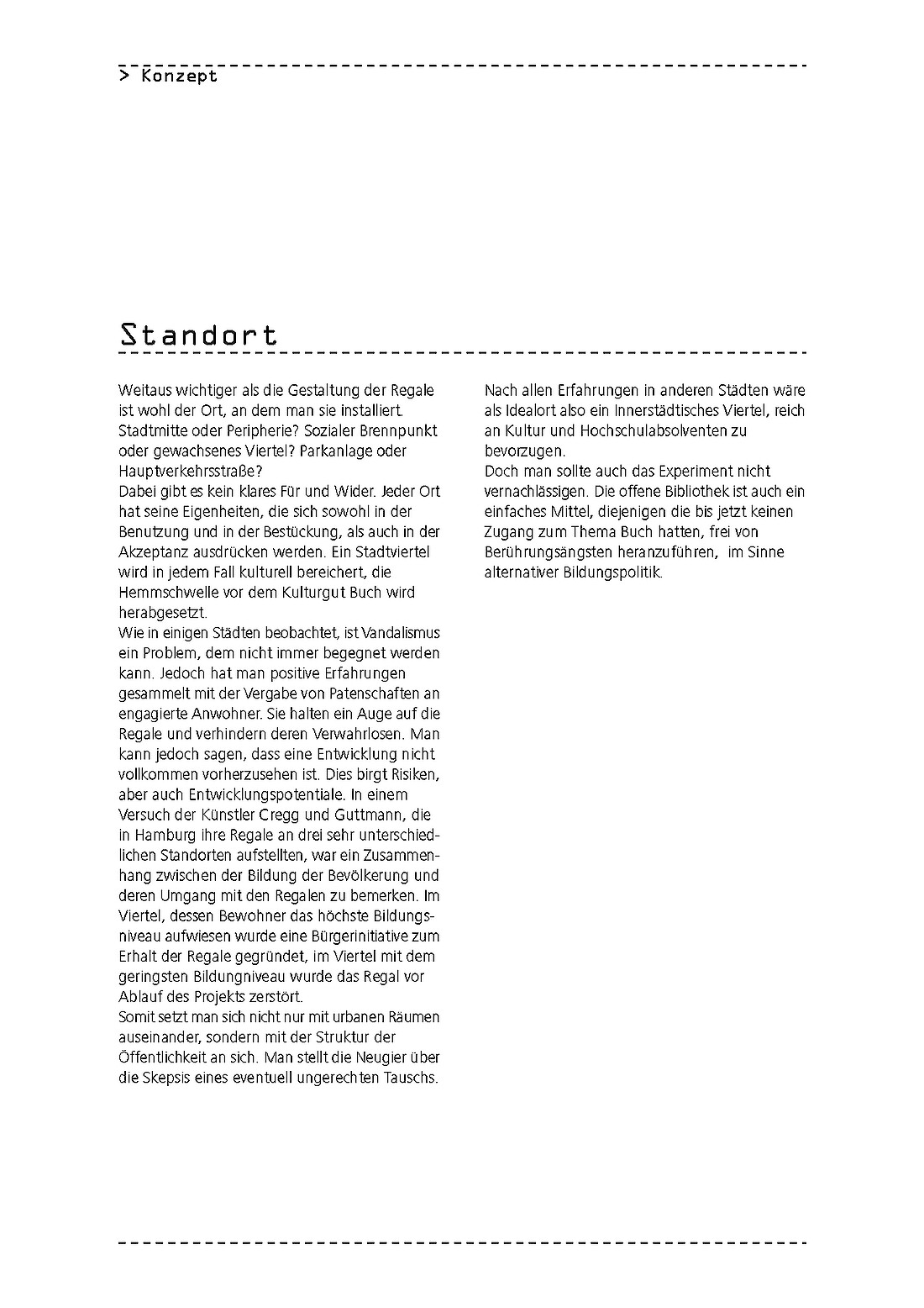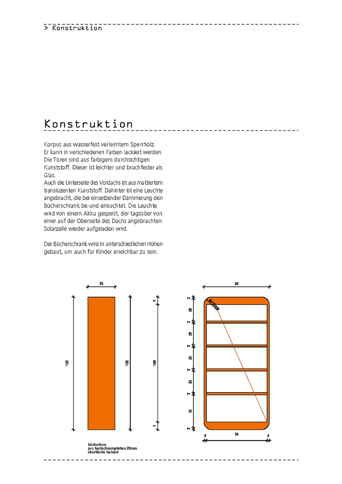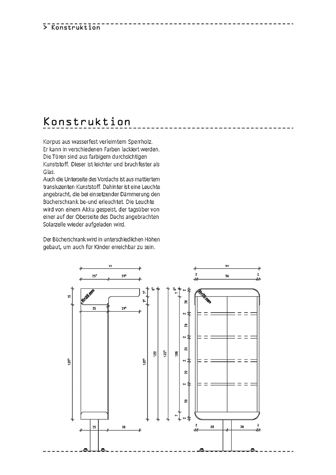 Die "lesbar - offene Bibliothek" wurde als, von uns selbst initiierter Projektbeitrag für das Europäische Kulturhauptstadt-Jahr 2007, die grenzüberschreitend in Luxemburg und der Großregion SaarLorLux stattfindet, entwickelt. An verschiedenen Orten im Saarland sollen einfache Bücherschränke aufgestellt werden. Diese werden an vorhandene Masten oder Pfosten montiert und benötigen somit keine eigenen Fundamente. Die Konstruktion ist robust und wetterfest, die Bücher sind vor der Witterung geschützt. Die Schränke sind mit einer durchsichtigen Tür versehen, wodurch die Bücher sichtbar bleiben. An den Schränken sind Hinweise zur Benutzung angebracht, die Bibliotheksordnung. Man wird aufgefordert, sich ein Buch auszuborgen, nach einer angemessenen Zeit wieder zurückzubringen und den Bestand eventuell mit Bücherspenden aufzustocken. Die Bücher stehen zur freien, uneingeschränkten, selbstverantwortlichen Benutzung zur Verfügung. Im Gegensatz zu normalen Bibliotheken deren Schwelle oft schon ein Hindernis darstellt, geht es hier um eine ständig offene, selbstorganisierte Bibliothek, als alternativer und experimenteller Ansatz. Wichtige Aspekte sind der Tausch und die Kommunikation. Über den Tausch werden direkte oder indirekte Verbindungen zwischen Personen hergestellt, es entsteht Kommunikation, es entsteht ein Raum für menschliche Begegnungen. Dort, wo Menschen zusammenkommen und miteinander kommunizieren, entstehen Orte. Orte sind Räume, die auf Menschen, die sie bewohnen, besuchen oder benutzen, eine identitätsstiftende Wirkung haben. Es werden die Grundqualitäten des öffentlichen Raums als Raum der Artikulation, der Aneignung, der Begegnung, des Austauschs und der Kommunikation stimuliert.