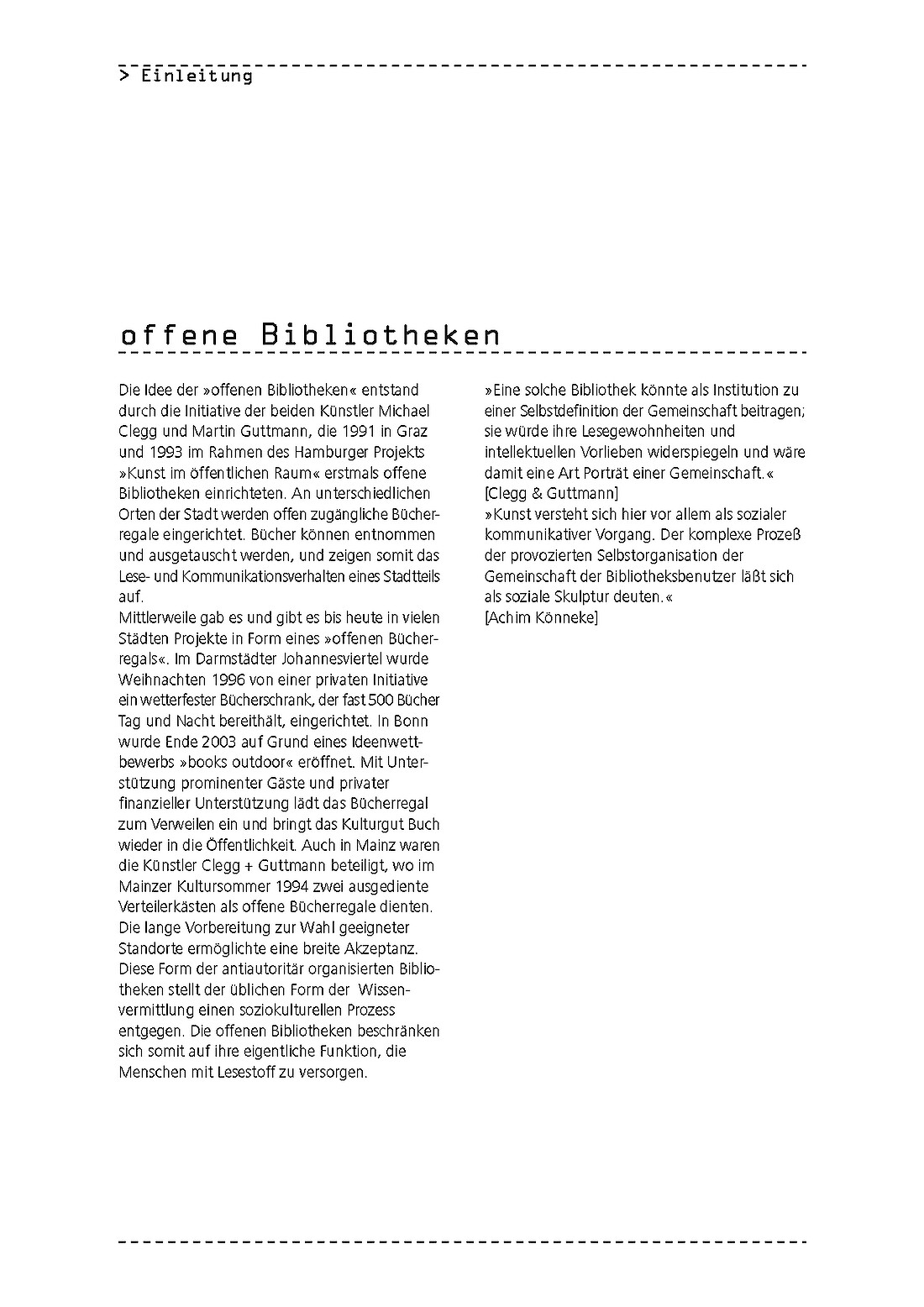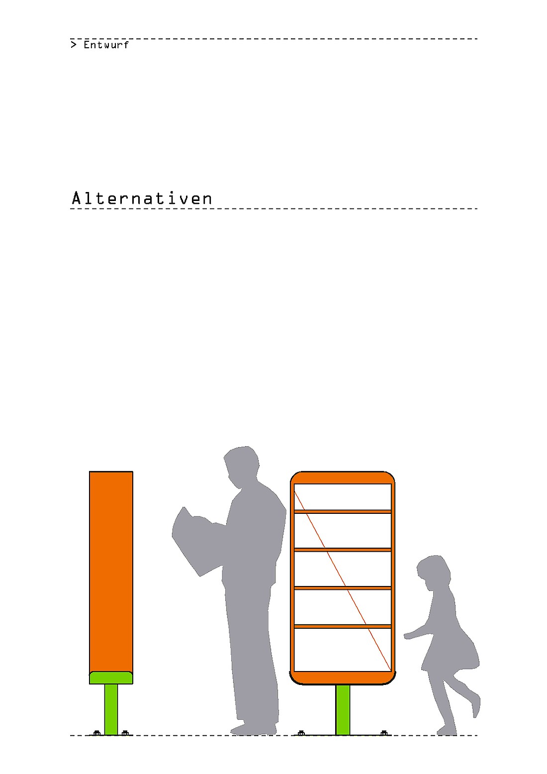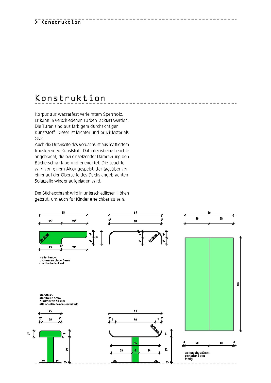 Die "lesbar - offene Bibliothek" wurde als, von uns selbst initiierter Projektbeitrag für das Europäische Kulturhauptstadt-Jahr 2007, die grenzüberschreitend in Luxemburg und der Großregion SaarLorLux stattfindet, entwickelt. An verschiedenen Orten im Saarland sollen einfache Bücherschränke aufgestellt werden. Diese werden an vorhandene Masten oder Pfosten montiert und benötigen somit keine eigenen Fundamente. Die Konstruktion ist robust und wetterfest, die Bücher sind vor der Witterung geschützt. Die Schränke sind mit einer durchsichtigen Tür versehen, wodurch die Bücher sichtbar bleiben. An den Schränken sind Hinweise zur Benutzung angebracht, die Bibliotheksordnung. Man wird aufgefordert, sich ein Buch auszuborgen, nach einer angemessenen Zeit wieder zurückzubringen und den Bestand eventuell mit Bücherspenden aufzustocken. Die Bücher stehen zur freien, uneingeschränkten, selbstverantwortlichen Benutzung zur Verfügung. Im Gegensatz zu normalen Bibliotheken deren Schwelle oft schon ein Hindernis darstellt, geht es hier um eine ständig offene, selbstorganisierte Bibliothek, als alternativer und experimenteller Ansatz. Wichtige Aspekte sind der Tausch und die Kommunikation. Über den Tausch werden direkte oder indirekte Verbindungen zwischen Personen hergestellt, es entsteht Kommunikation, es entsteht ein Raum für menschliche Begegnungen. Dort, wo Menschen zusammenkommen und miteinander kommunizieren, entstehen Orte. Orte sind Räume, die auf Menschen, die sie bewohnen, besuchen oder benutzen, eine identitätsstiftende Wirkung haben. Es werden die Grundqualitäten des öffentlichen Raums als Raum der Artikulation, der Aneignung, der Begegnung, des Austauschs und der Kommunikation stimuliert.