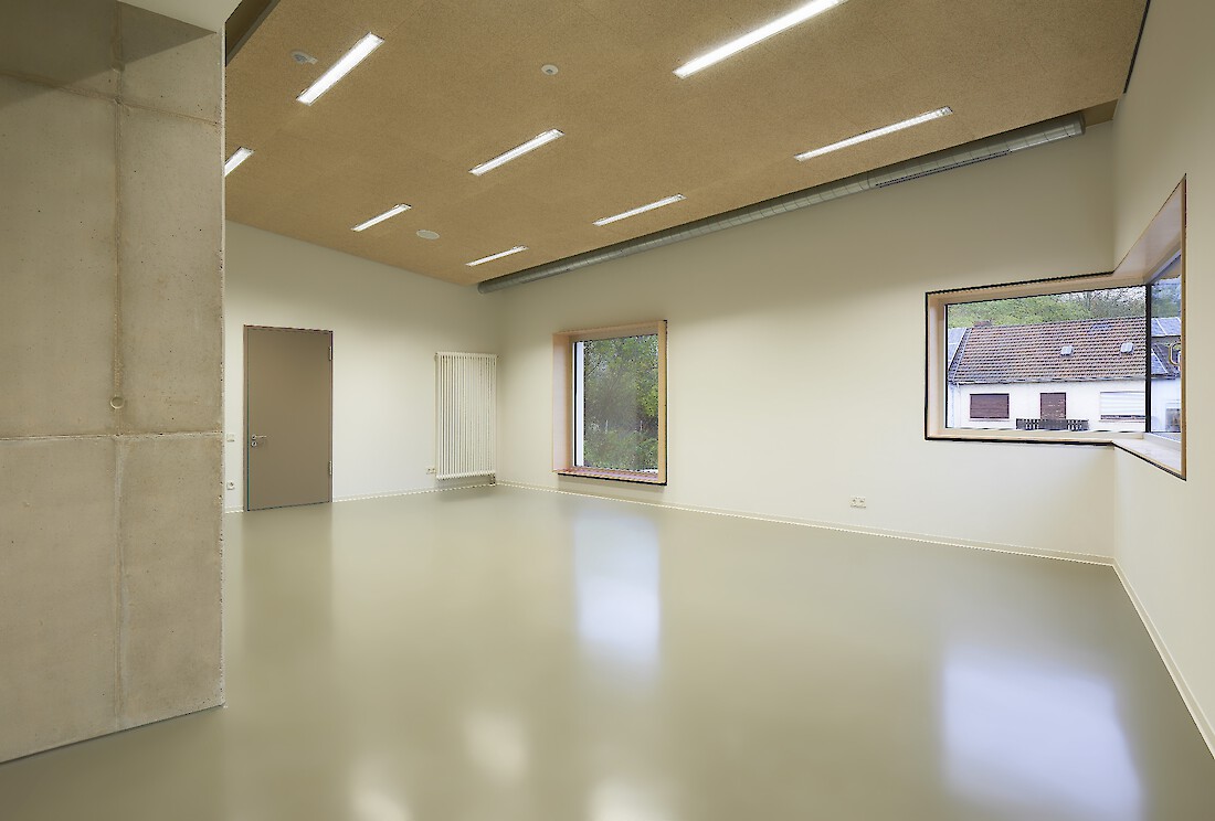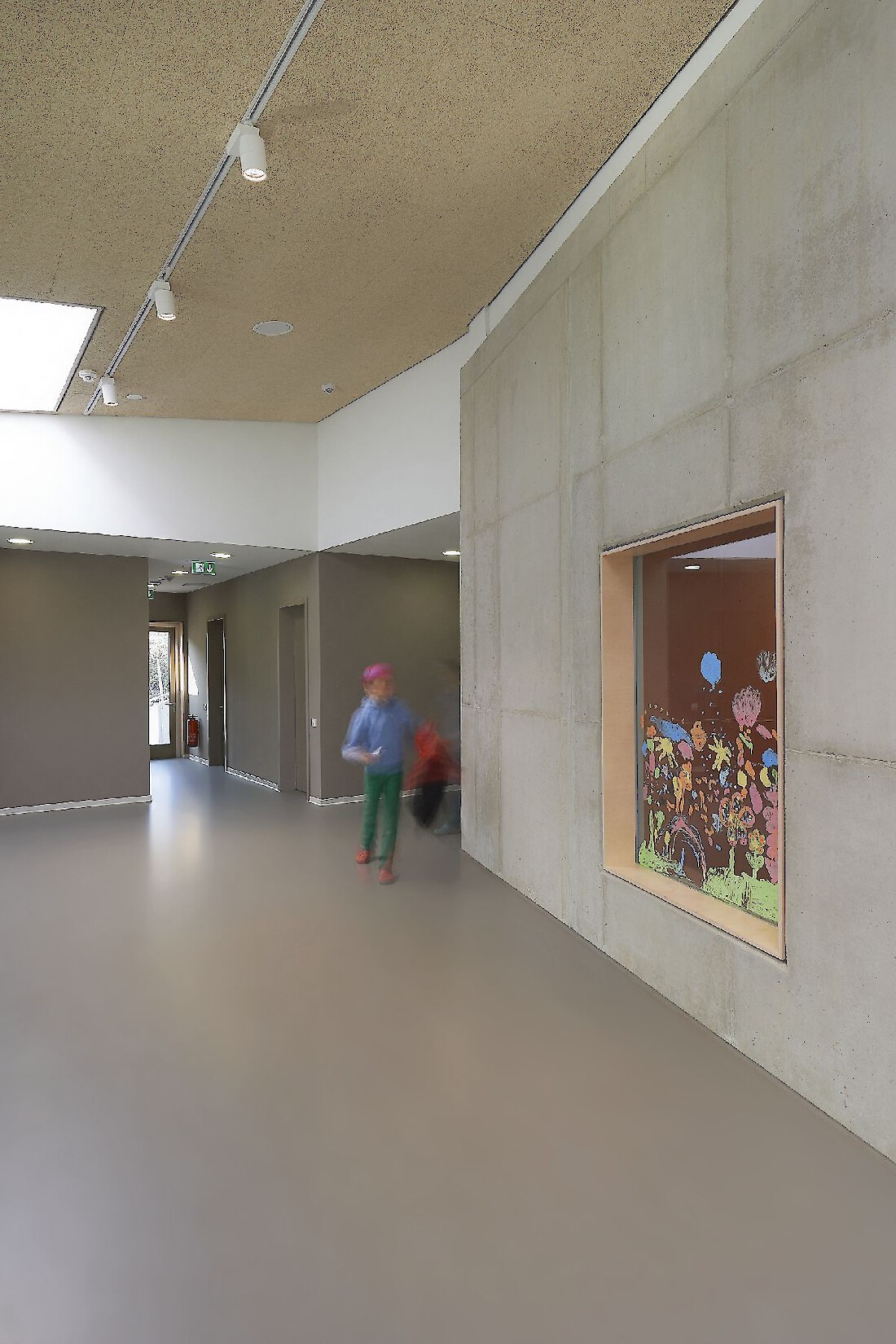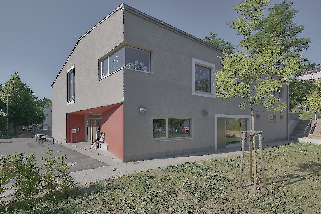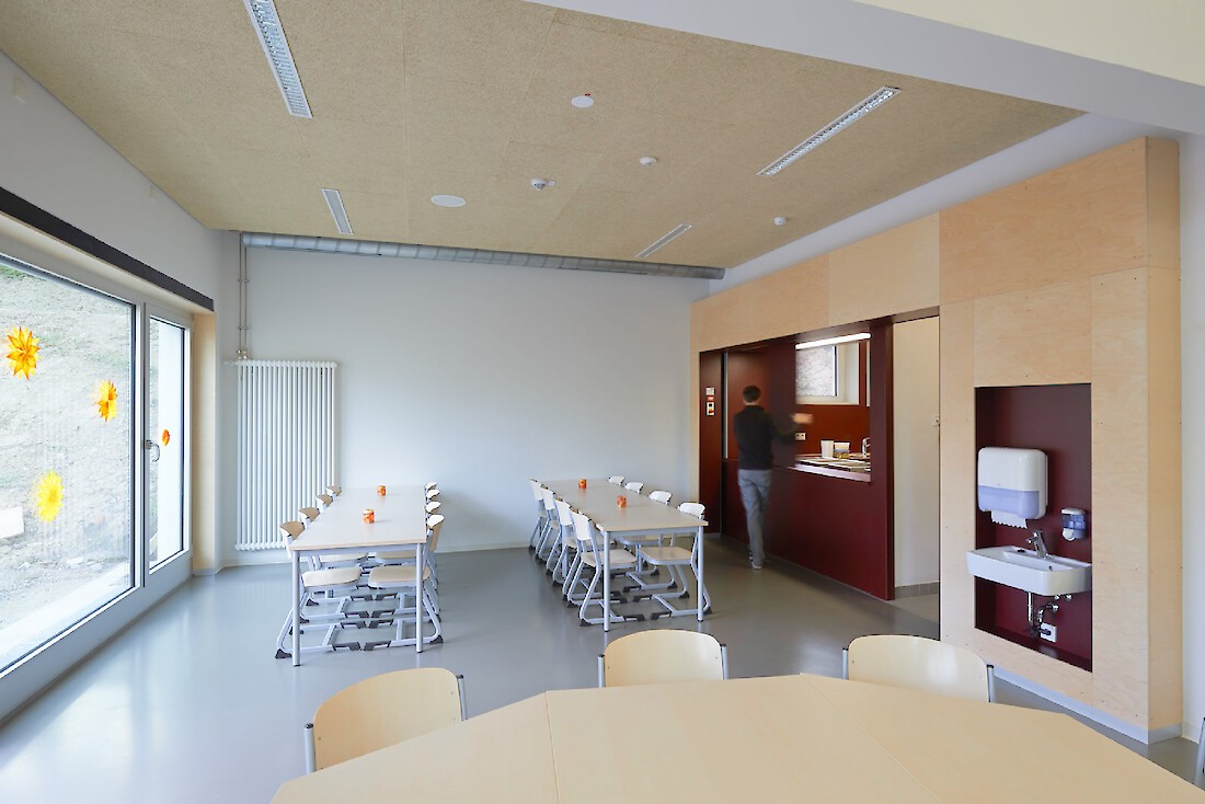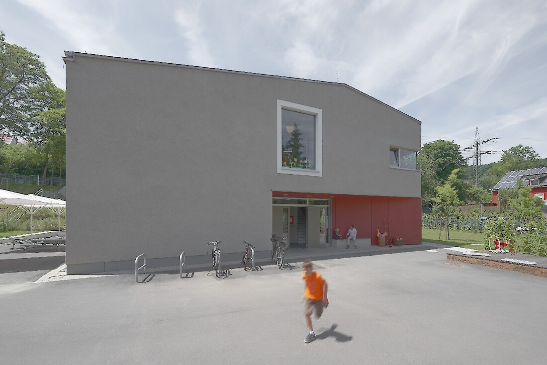 Die Montessori-Grundschule liegt im Ortskern des Saarbrücker Stadtteils Rußhütte und ist in einem im 19.Jahrhundert erbauten Schulhaus untergebracht. Im Zuge des Ausbaus zur Ganztagsschule ist bis zum Schuljahr 2013/14 eine Erweiterung für die Nachbetreuung entstanden. Die Außenanlagen wurden 2015 vollendet. Der zweigeschossige Neubau nimmt 6 Gruppenräume, Multifunktionsraum mit Küche sowie diverse Nebenräume auf. Um auf die, durch einen Bahndamm topografisch beengte Grundstückssituation zu reagieren, wurde eine Gebäudeseite um 15° gedreht. Auf diese Weise entstand ein keilförmiger Grundriss, der das Gebäudevolumen optisch kompakt hält und die städtebauliche Raumsituation verbessert. Die Giebelfassade wendet sich zur Hauptzufahrt und schafft dort eine empfangende Geste. Hier befindet sich der Haupteingang, der durch eine Einkerbung gekennzeichnet wird und mit seiner Oberfläche, der an den roten Klinker der Nachbarbauten erinnert, den Bezug zur Umgebung herstellt. Hier werden Kinder und Besucher in der Tradition eines freundlichen Willkommensgruß mit Wetterschutz und Sitzgelegenheit empfangen. Es wurde eine Form gefunden, die dem Gebäude Selbstverständlichkeit verleiht und dem Ort Identität stiftet. Das geneigte Dach verstärkt den funktionalen Zusammenhang mit dem Altbau. Zugleich wird somit auf die Urform eines Hauses – für die Kinder ein einprägsames Bild ihrer Schule - verwiesen. Dem knappen Budget geschuldet, werden Materialien ehrlich und unverkleidet eingesetzt, technische Funktionen wie Lüftungsrohre und Leitungen sichtbar gelassen. Zusammen mit den Innenräumen, die durch eine präsente Deckenneigung, Aufweitungen und große Öffnungen sowie vielfältige Blickbeziehungen geprägt sind, entsteht aber eine Atmosphäre der Behaglichkeit und unerwarteter Großzügigkeit. Der Maßstab, die Ausformulierung der Fassade, das Satteldach, der erdige Kratzputz, szenische Ein- und Ausblicke der Fenster untermauern diese Haltung.