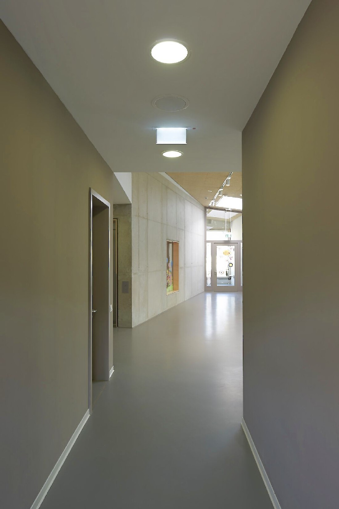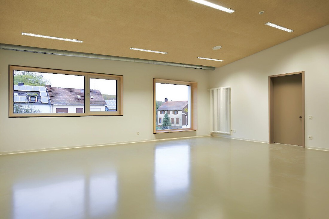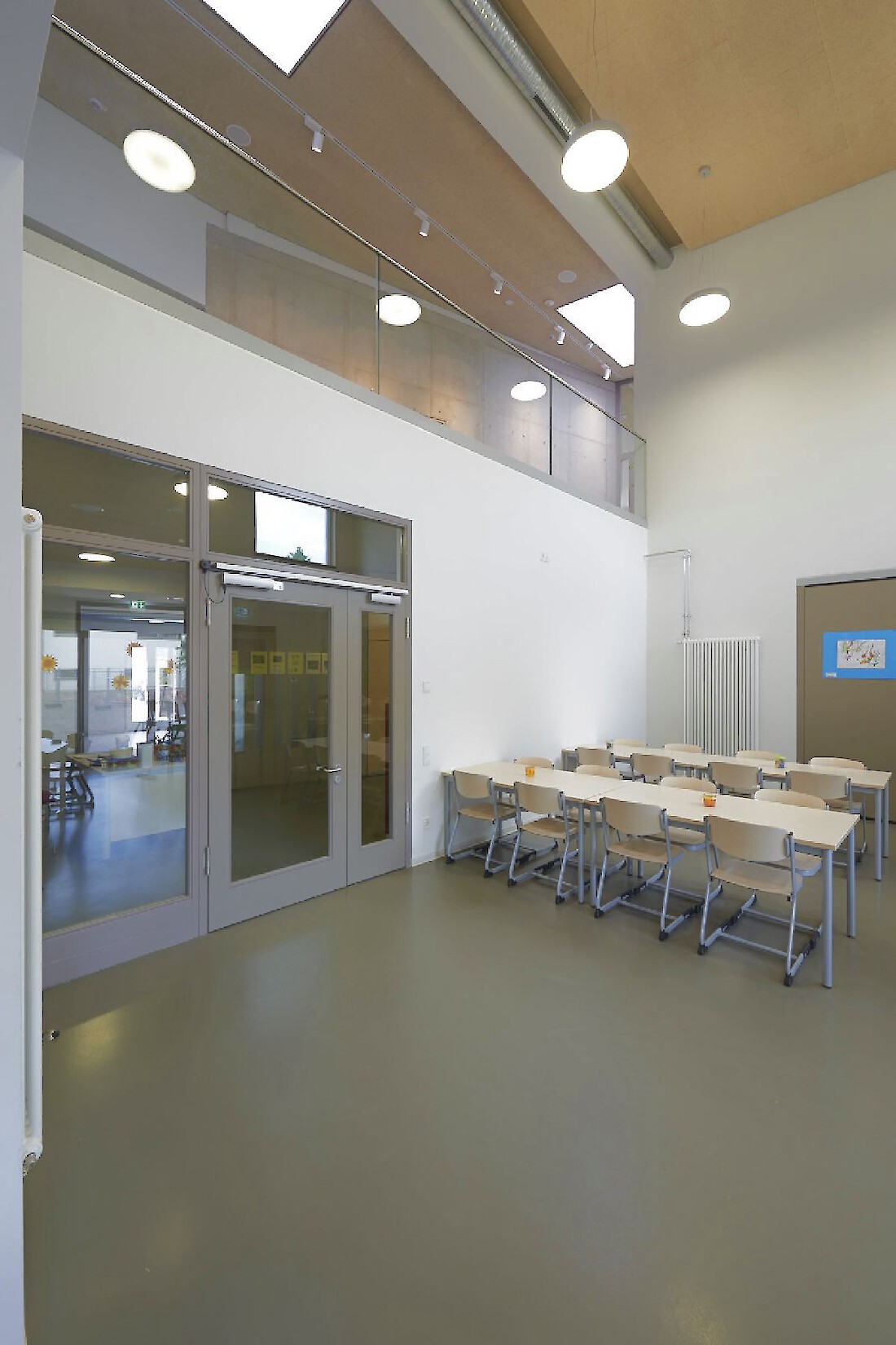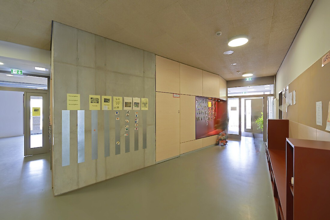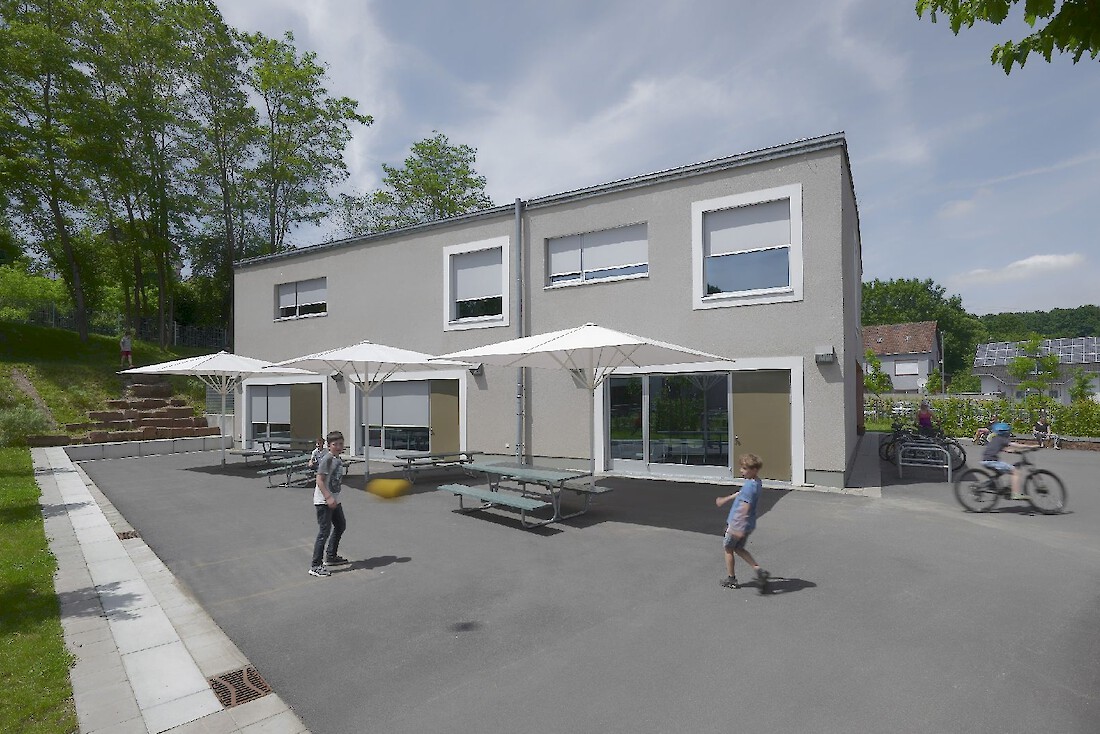 Die Montessori-Grundschule liegt im Ortskern des Saarbrücker Stadtteils Rußhütte und ist in einem im 19.Jahrhundert erbauten Schulhaus untergebracht. Im Zuge des Ausbaus zur Ganztagsschule ist bis zum Schuljahr 2013/14 eine Erweiterung für die Nachbetreuung entstanden. Die Außenanlagen wurden 2015 vollendet. Der zweigeschossige Neubau nimmt 6 Gruppenräume, Multifunktionsraum mit Küche sowie diverse Nebenräume auf. Um auf die, durch einen Bahndamm topografisch beengte Grundstückssituation zu reagieren, wurde eine Gebäudeseite um 15° gedreht. Auf diese Weise entstand ein keilförmiger Grundriss, der das Gebäudevolumen optisch kompakt hält und die städtebauliche Raumsituation verbessert. Die Giebelfassade wendet sich zur Hauptzufahrt und schafft dort eine empfangende Geste. Hier befindet sich der Haupteingang, der durch eine Einkerbung gekennzeichnet wird und mit seiner Oberfläche, der an den roten Klinker der Nachbarbauten erinnert, den Bezug zur Umgebung herstellt. Hier werden Kinder und Besucher in der Tradition eines freundlichen Willkommensgruß mit Wetterschutz und Sitzgelegenheit empfangen. Es wurde eine Form gefunden, die dem Gebäude Selbstverständlichkeit verleiht und dem Ort Identität stiftet. Das geneigte Dach verstärkt den funktionalen Zusammenhang mit dem Altbau. Zugleich wird somit auf die Urform eines Hauses – für die Kinder ein einprägsames Bild ihrer Schule - verwiesen. Dem knappen Budget geschuldet, werden Materialien ehrlich und unverkleidet eingesetzt, technische Funktionen wie Lüftungsrohre und Leitungen sichtbar gelassen. Zusammen mit den Innenräumen, die durch eine präsente Deckenneigung, Aufweitungen und große Öffnungen sowie vielfältige Blickbeziehungen geprägt sind, entsteht aber eine Atmosphäre der Behaglichkeit und unerwarteter Großzügigkeit. Der Maßstab, die Ausformulierung der Fassade, das Satteldach, der erdige Kratzputz, szenische Ein- und Ausblicke der Fenster untermauern diese Haltung.