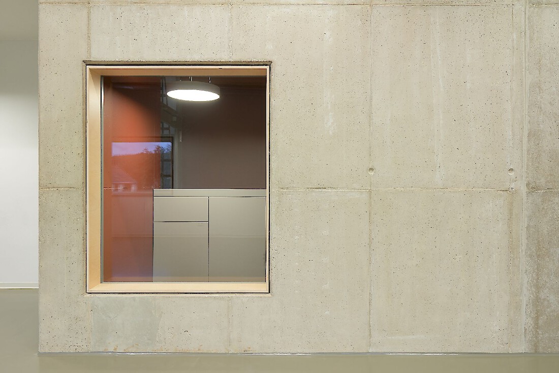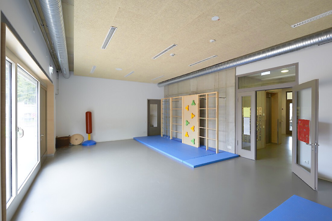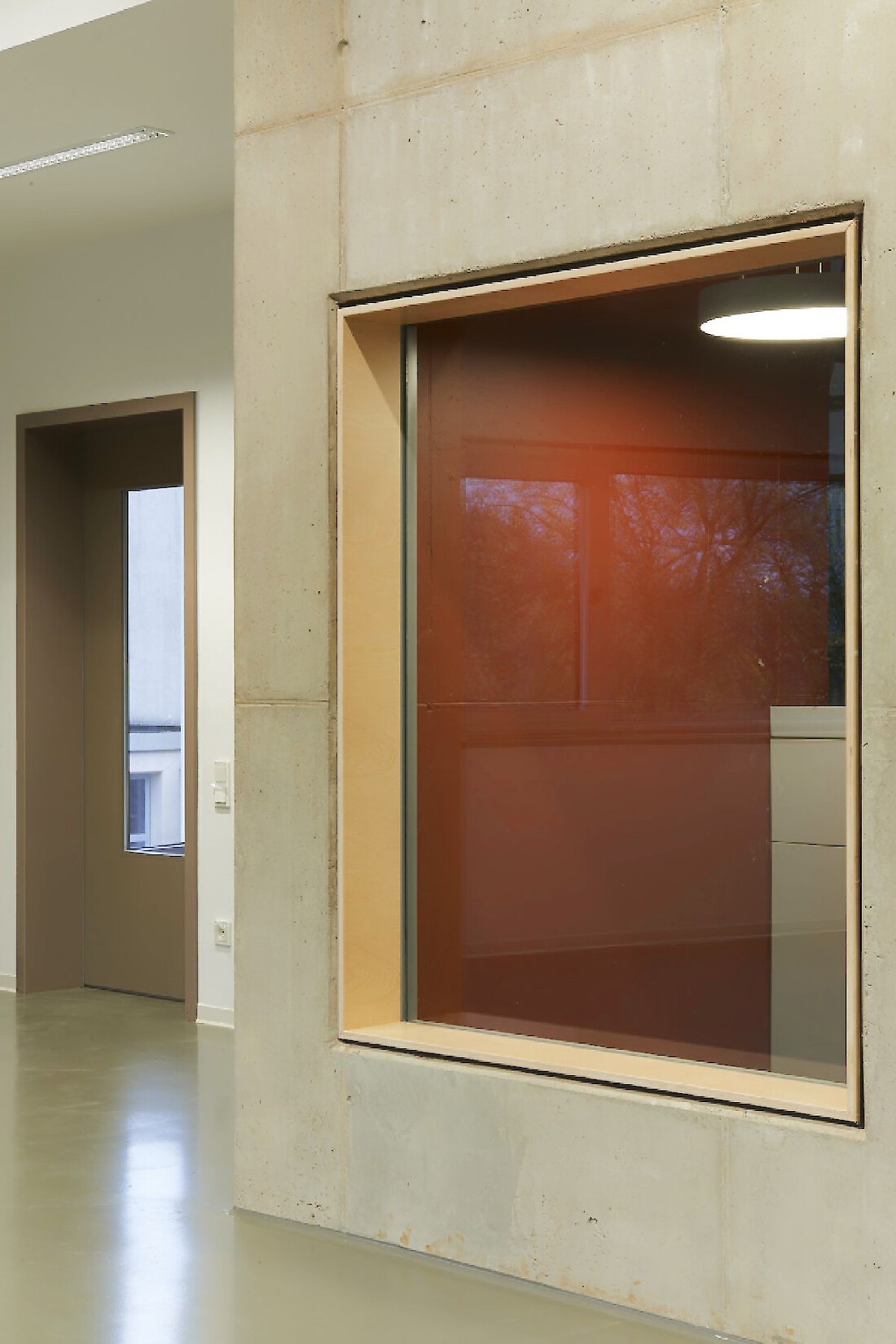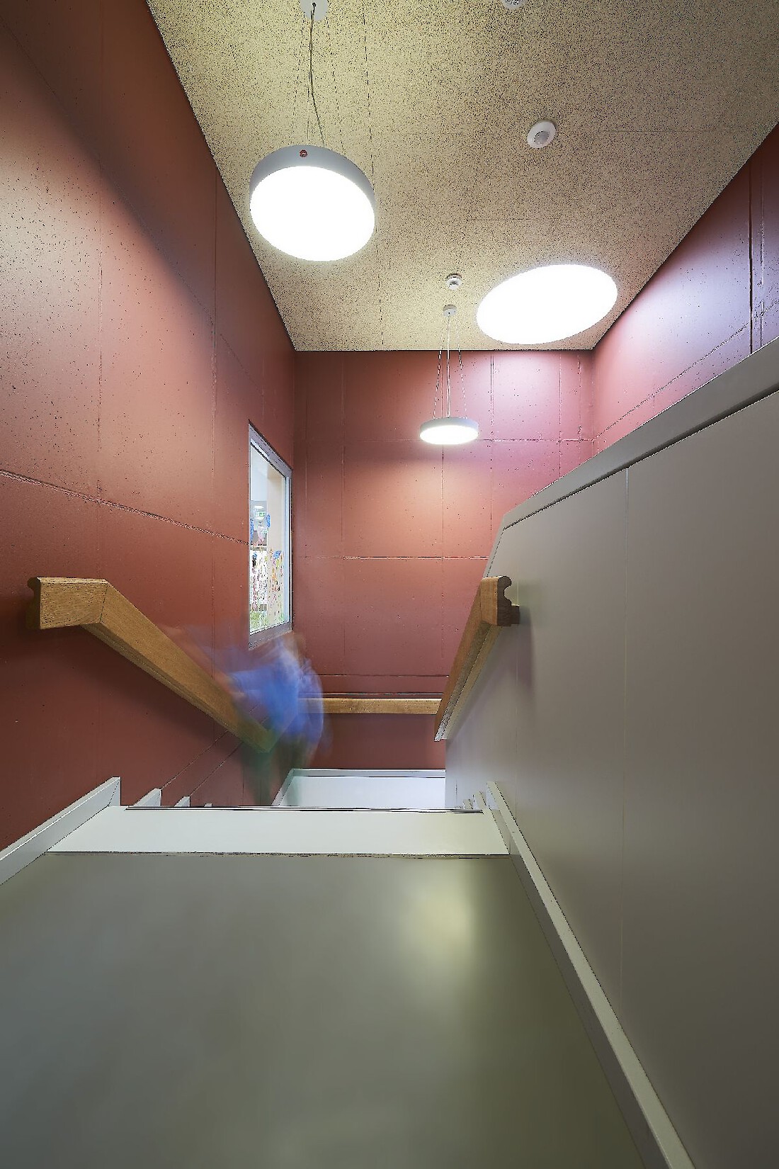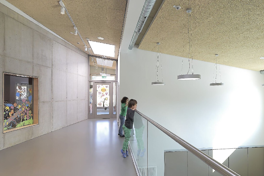 Die Montessori-Grundschule liegt im Ortskern des Saarbrücker Stadtteils Rußhütte und ist in einem im 19.Jahrhundert erbauten Schulhaus untergebracht. Im Zuge des Ausbaus zur Ganztagsschule ist bis zum Schuljahr 2013/14 eine Erweiterung für die Nachbetreuung entstanden. Die Außenanlagen wurden 2015 vollendet. Der zweigeschossige Neubau nimmt 6 Gruppenräume, Multifunktionsraum mit Küche sowie diverse Nebenräume auf. Um auf die, durch einen Bahndamm topografisch beengte Grundstückssituation zu reagieren, wurde eine Gebäudeseite um 15° gedreht. Auf diese Weise entstand ein keilförmiger Grundriss, der das Gebäudevolumen optisch kompakt hält und die städtebauliche Raumsituation verbessert. Die Giebelfassade wendet sich zur Hauptzufahrt und schafft dort eine empfangende Geste. Hier befindet sich der Haupteingang, der durch eine Einkerbung gekennzeichnet wird und mit seiner Oberfläche, der an den roten Klinker der Nachbarbauten erinnert, den Bezug zur Umgebung herstellt. Hier werden Kinder und Besucher in der Tradition eines freundlichen Willkommensgruß mit Wetterschutz und Sitzgelegenheit empfangen. Es wurde eine Form gefunden, die dem Gebäude Selbstverständlichkeit verleiht und dem Ort Identität stiftet. Das geneigte Dach verstärkt den funktionalen Zusammenhang mit dem Altbau. Zugleich wird somit auf die Urform eines Hauses – für die Kinder ein einprägsames Bild ihrer Schule - verwiesen. Dem knappen Budget geschuldet, werden Materialien ehrlich und unverkleidet eingesetzt, technische Funktionen wie Lüftungsrohre und Leitungen sichtbar gelassen. Zusammen mit den Innenräumen, die durch eine präsente Deckenneigung, Aufweitungen und große Öffnungen sowie vielfältige Blickbeziehungen geprägt sind, entsteht aber eine Atmosphäre der Behaglichkeit und unerwarteter Großzügigkeit. Der Maßstab, die Ausformulierung der Fassade, das Satteldach, der erdige Kratzputz, szenische Ein- und Ausblicke der Fenster untermauern diese Haltung.
