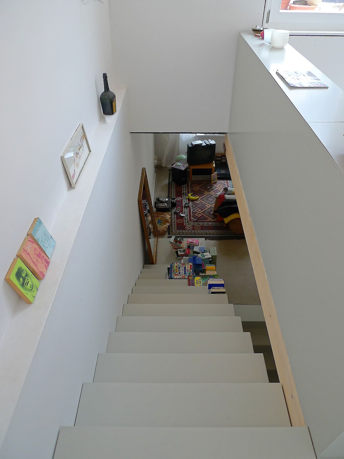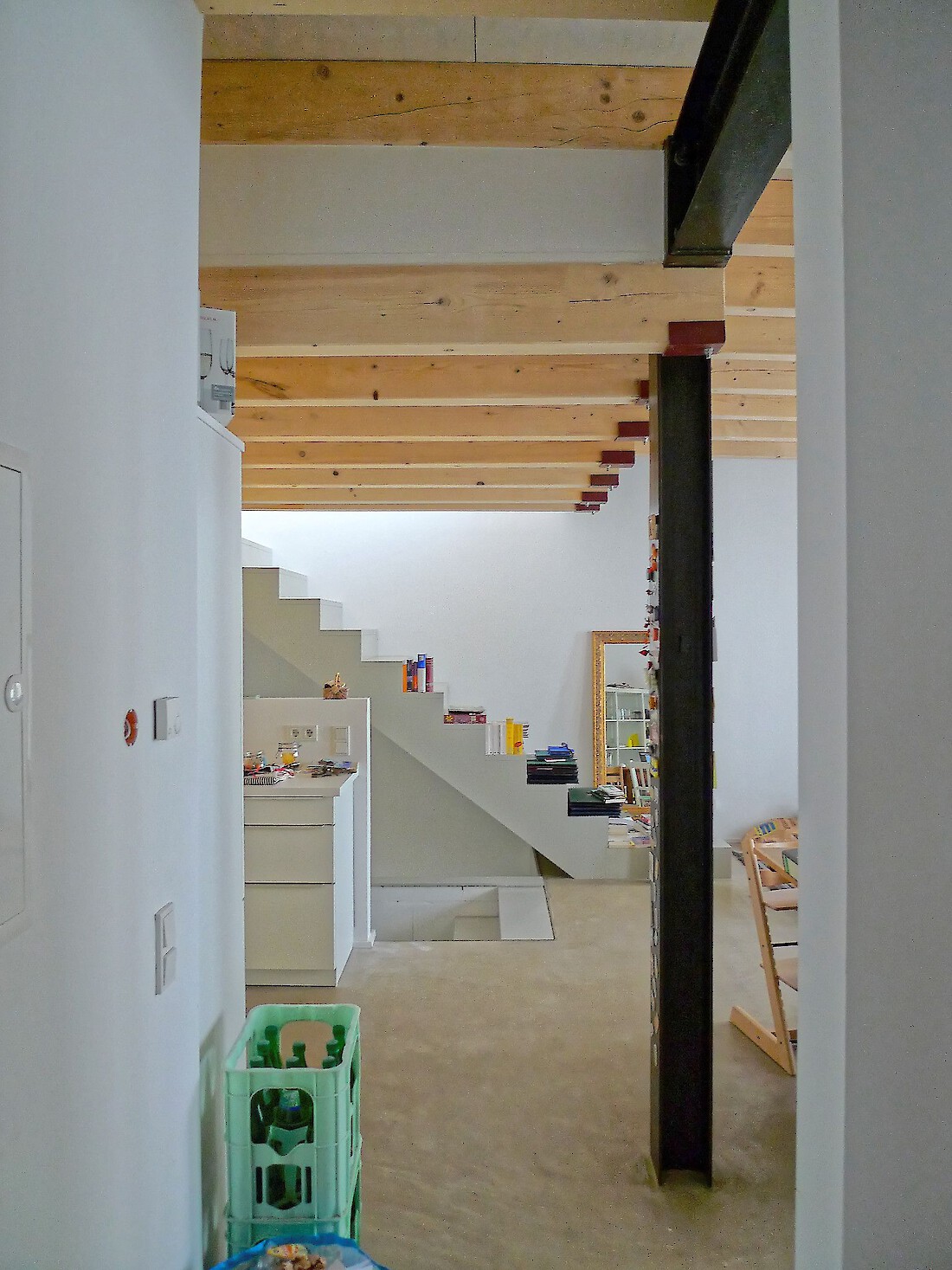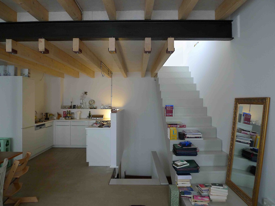 Der Traum vom Eigenheim lässt sich scheinbar oft nur am Stadtrand verwirklichen. Innerstädtische Baugrundstücke sind auf dem Markt rar, aber mitten in der Stadt, in einem Innenhof hat die Familie ein seit Jahren unbewohntes und heruntergekommenes Hinterhofgebäude mitten im Nauwieser Viertel gefunden. Trotz schwieriger Randbedingungen und beengter Verhältnisse wurde das ehemalige Lagergebäude für Süsswaren in ein vollwertiges Haus mit zwei Wohneinheiten, Atelier und Dachterrasse umgewandelt. Nach der saarländischen Landesbauordnung ist das Gebäude der Gebäudeklasse 2 zugeordnet. Für beide Wohnungseinheiten wird ein gemeinsames Treppenhaus geschaffen. Auf der rechten Gebäudeseite wird eine Dachaufstockung vorgenommen, so dass darunter Aufenthaltsräume möglich sind. Das restliche Pultdach wird entfernt und ein Dachterrasse errichtet. Auf der linken Gebäudeseite wird ein Hof geschaffen der den Einbau von Fenstern und die Belichtung und Belüftung der dahinterliegenden Räume ermöglicht.