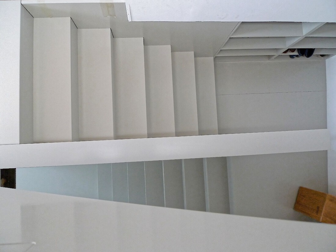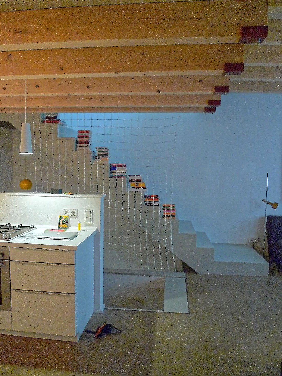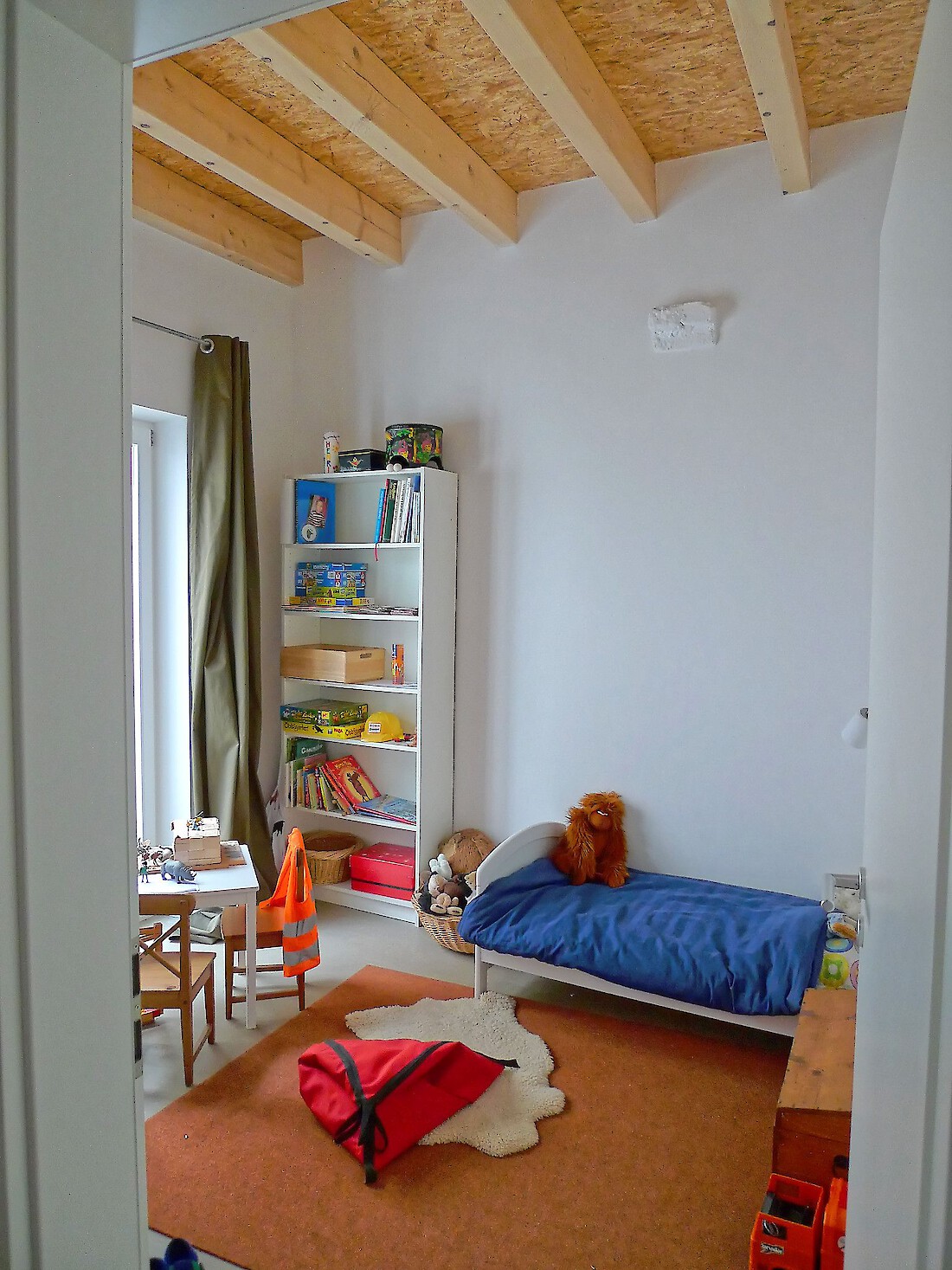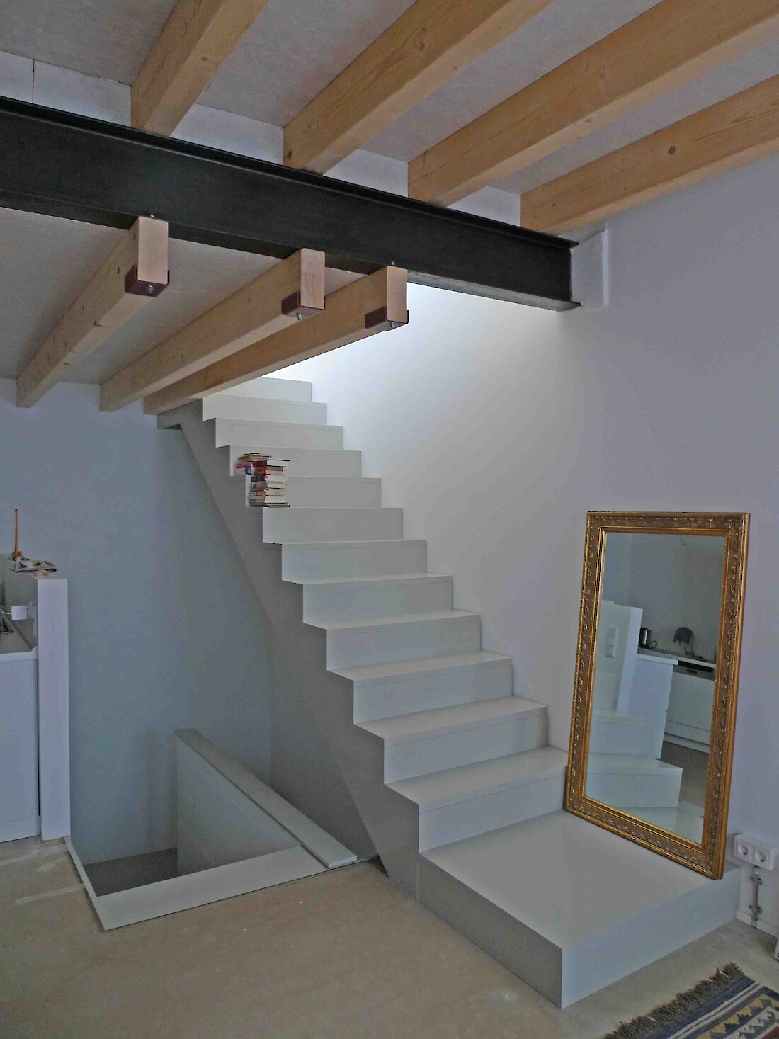 Der Traum vom Eigenheim lässt sich scheinbar oft nur am Stadtrand verwirklichen. Innerstädtische Baugrundstücke sind auf dem Markt rar, aber mitten in der Stadt, in einem Innenhof hat die Familie ein seit Jahren unbewohntes und heruntergekommenes Hinterhofgebäude mitten im Nauwieser Viertel gefunden. Trotz schwieriger Randbedingungen und beengter Verhältnisse wurde das ehemalige Lagergebäude für Süsswaren in ein vollwertiges Haus mit zwei Wohneinheiten, Atelier und Dachterrasse umgewandelt. Nach der saarländischen Landesbauordnung ist das Gebäude der Gebäudeklasse 2 zugeordnet. Für beide Wohnungseinheiten wird ein gemeinsames Treppenhaus geschaffen. Auf der rechten Gebäudeseite wird eine Dachaufstockung vorgenommen, so dass darunter Aufenthaltsräume möglich sind. Das restliche Pultdach wird entfernt und ein Dachterrasse errichtet. Auf der linken Gebäudeseite wird ein Hof geschaffen der den Einbau von Fenstern und die Belichtung und Belüftung der dahinterliegenden Räume ermöglicht.