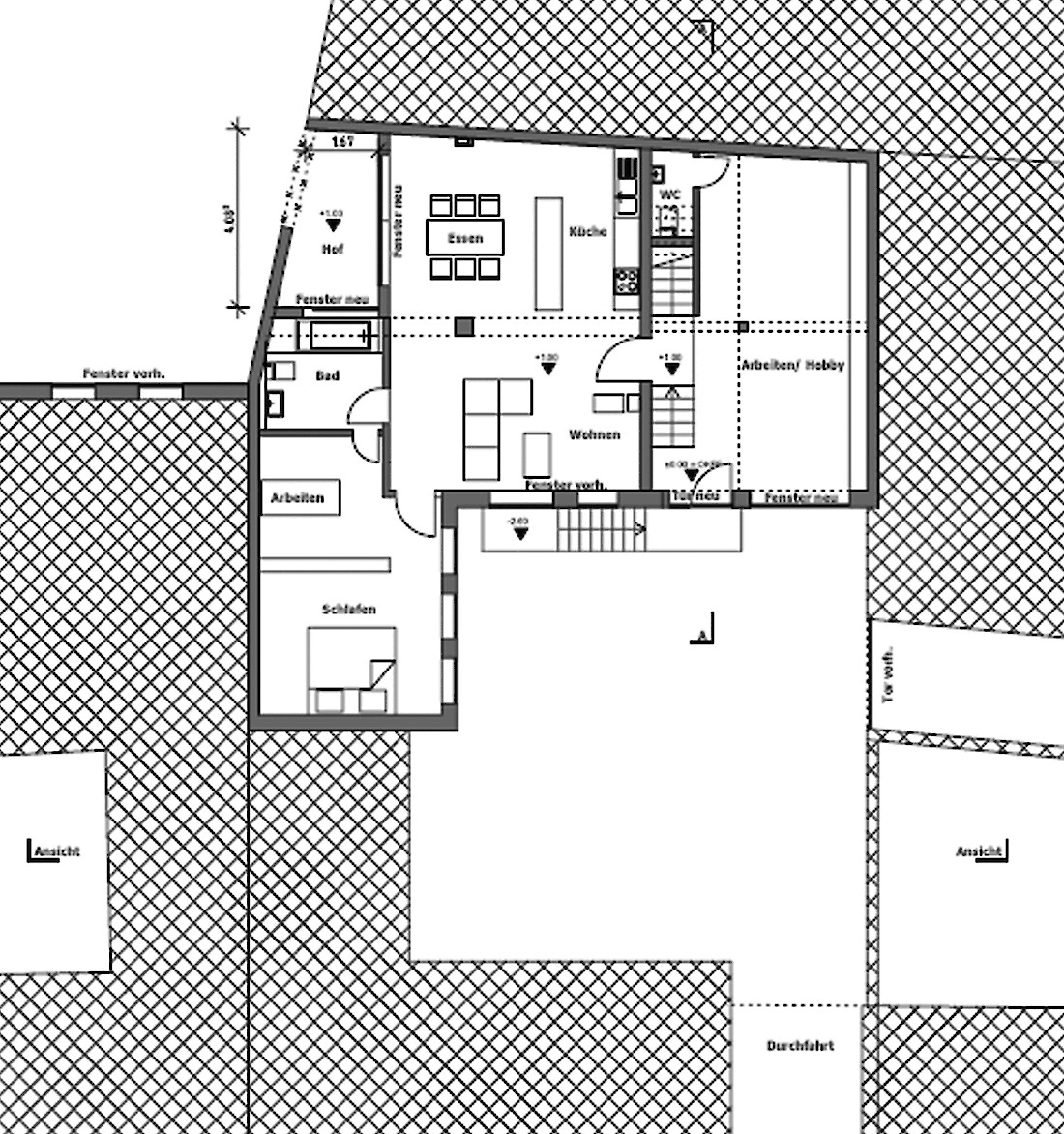 Programm Umbau des Hinterhofgebäudes zu zwei Wohnheinheiten mit Atelier und Büroteil