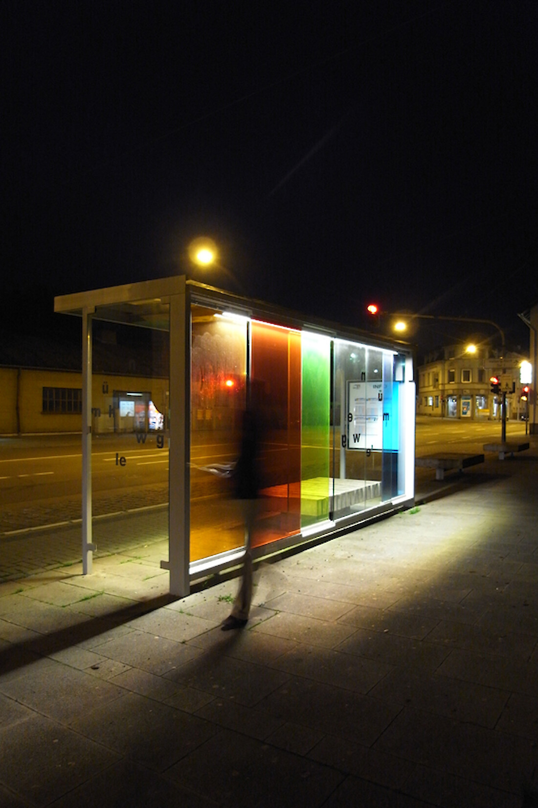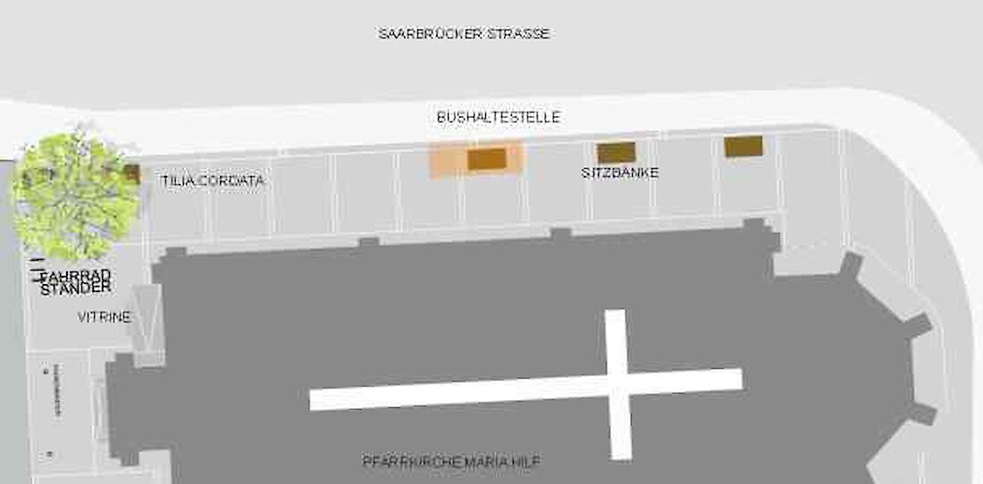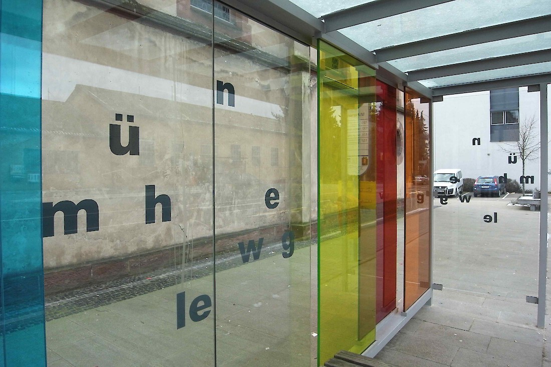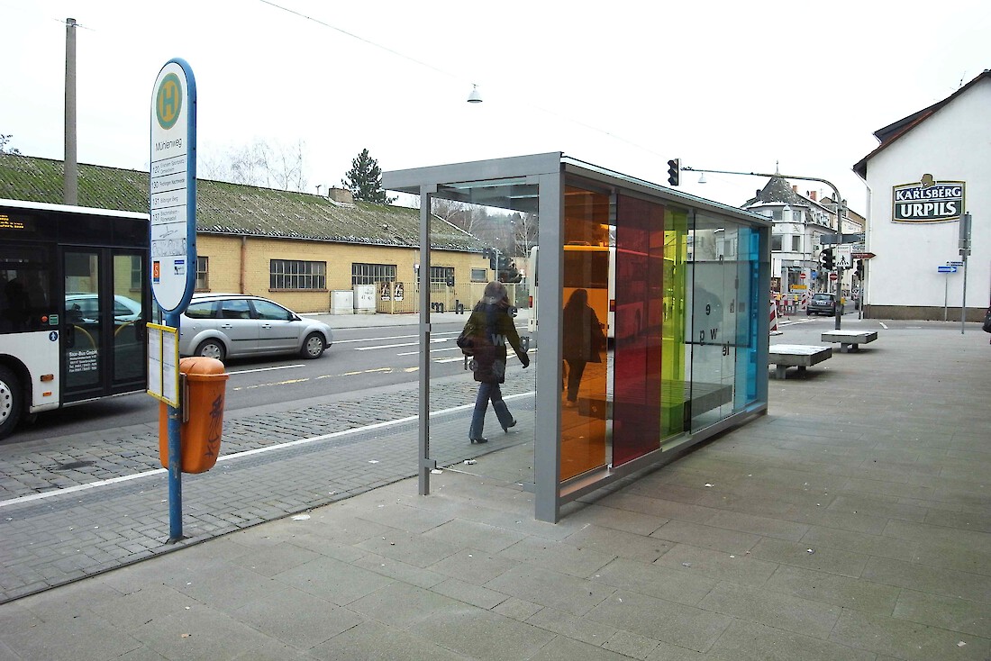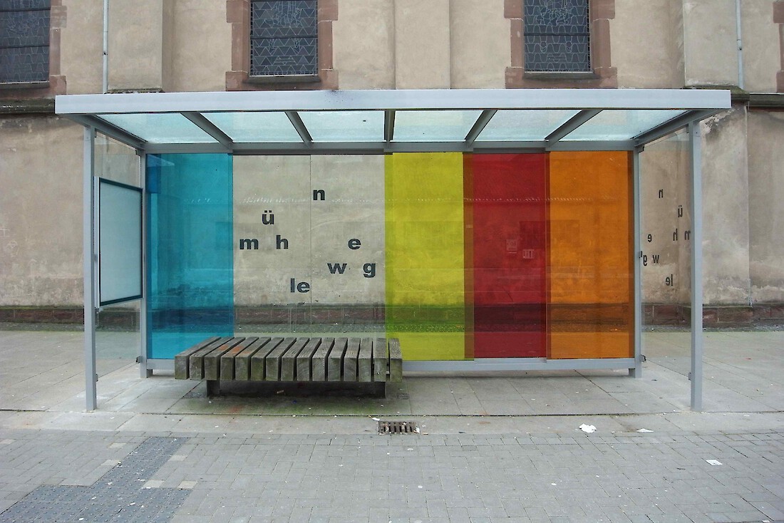 In Nachbarschaft zum 2005 entstandenen Kirchplatz ist im Rahmen der Neugestaltung der Saarbrücker Strasse ein neues Wartehäuschen der Bushaltestelle »Mühlenweg« hinzugekommen. In einem heterogenen Umfeld soll das Wartehäuschen an der Nahtstelle zwischen der Industrieanlage »Halberger Hütte« und katholischer Pfarrkirche Maria-Hilf einen farbigen Akzent setzen und somit den eher tristen Strassenraum beleben. Kleinbauten dieser Art tragen wesentlich zum Erscheinungsbild des öffentlichen Raums bei und ihre Qualität kann die Identfikation der Bürger mit ihrem Stadtteil fördern. Das ca. 5,00 m lange und 2,50 m hohe Wartehäuschen besteht aus einer Stahlrahmen-Konstruktion, die teilweise farbigen Gläsern ausgefacht wird. In die Anlage wurde eine der vier, in Reihe stehenden vorhandenen Sitzbänke aus Holz integriert. Die Farben nehmen den Rhythmus der Sitzbänke (3+1) in umgekehrter Reihenfolge auf, wobei das Farbspektrum der Gläser von kalt (blau) zu warm (gelb-orange-rot) steigt.