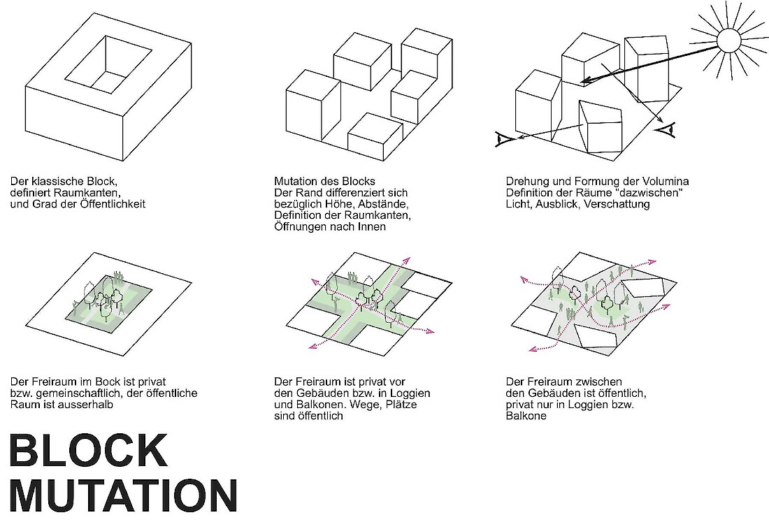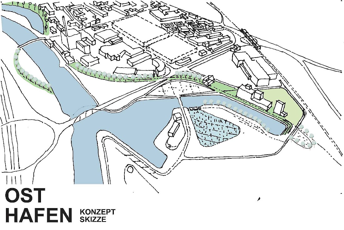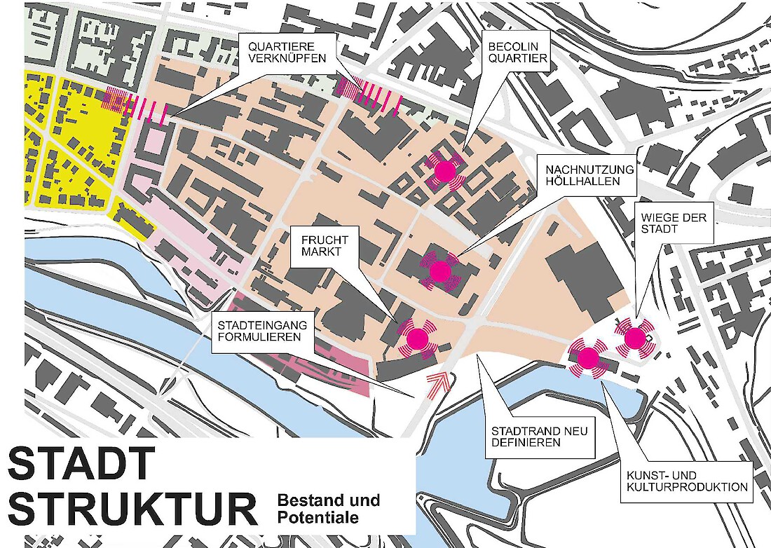 Die gründerzeitliche Stadt mit ihren klaren Blockstrukturen im nördlichen Bereich des Bearbeitungsgebietes soll als städtebauliche Matrix dienen, um des aktuelle Gewerbe-und Industriegebiet in ein Mischgebiet umzuwandeln. Dabei werden die offenen Bebauungsstrukturen mit gewerblichen Nutzungen integriert, um einen attraktive öffentliche Strassenräume zu schaffen. Die Umwandlung des bestehenden Industrie-und Gewerbegebietes in ein poröses zentrales Stadtquartier im Osten der Stadt, ganz im Sinne der nutzungsdurchmischten europäischen Stadt, ist das Leitbild für die zukünftige Stadtentwicklung. Dabei wird eine nutzungsverträgliche Konversion angestrebt, die langfristig Wohnen und Arbeiten an einem Ort ermöglicht.