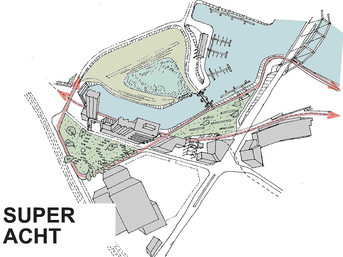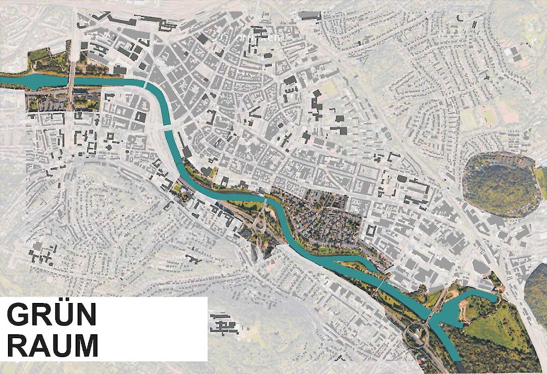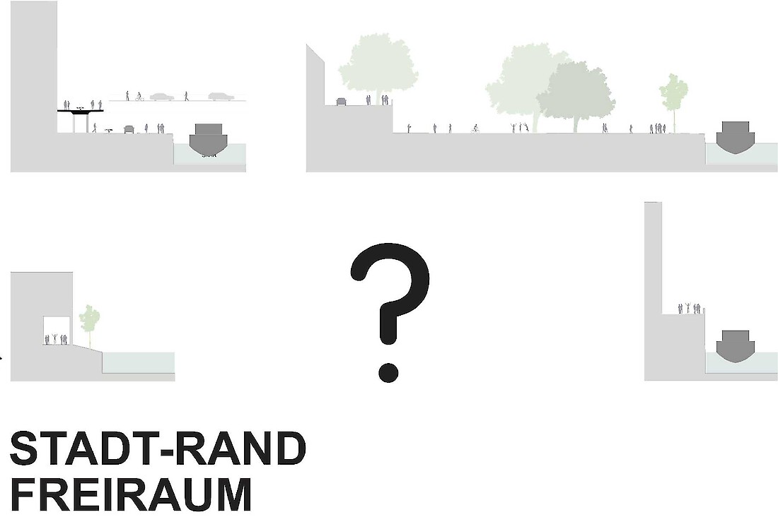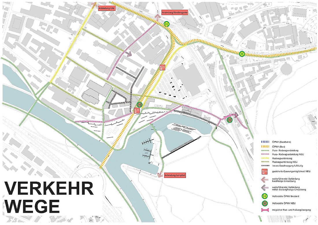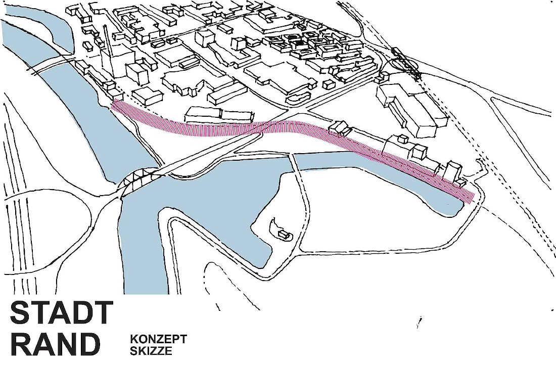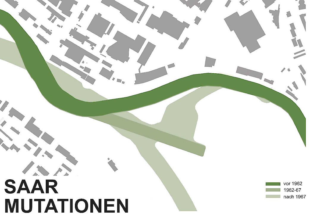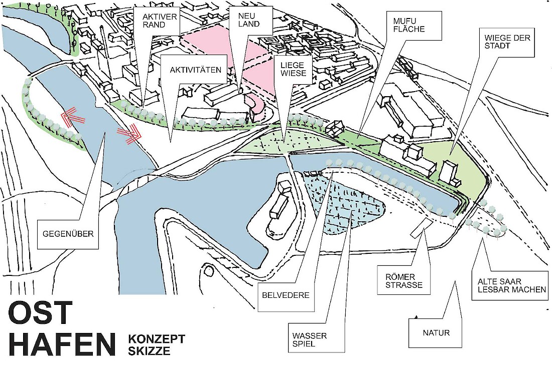 Ziel unseres Entwurfes ist die Schaffung einer neuen Stadtkante mit klarer Abgrenzung zum Flussraum. Es soll eine urbane Stadtsilhouette mit gestalterisch hochwertigen öffentlichen Räumen und Gebäudefronten entstehen. Die perlenkettenartige Bebauung entlang der Flussraumkante erhält eine klarem Sichtbezug zum Fluss. Der alte Saarverlauf und der zugehörige Flussraum soll wieder erkennbar und erlebbar gemacht werden, indem die Ufergestaltung abgeflacht wird, um der ursprünglichen Überschwemmungszone Rechnung zu tragen. Auf diese Weise entstehen neue Sichten auf den Fluss.