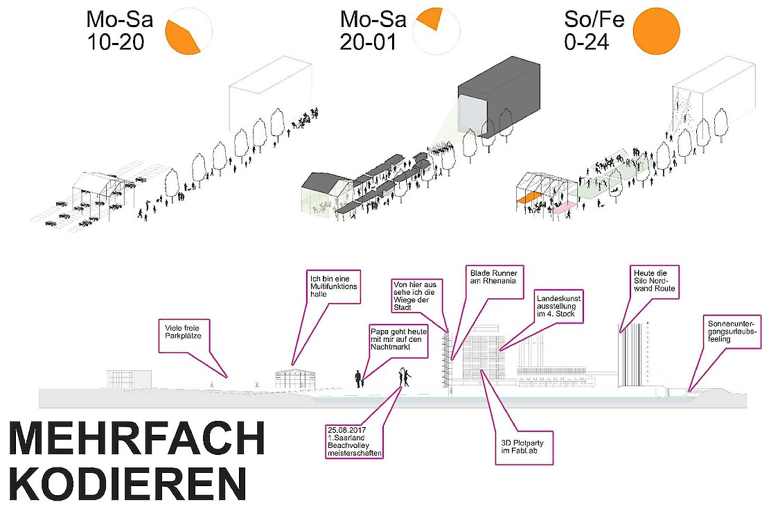 Die vorgeschlagenen Freizeitnutzungen für den öffentlichen Raum an der Saar orientieren sich sehr stark an die bestehenden Angebote und komplettieren den schon attraktiven Ort um die Silo- und Rhenaniabauten durch weitere Spots. Dabei sind alternative und partizipative Gestaltungsprozesse der Räume erwünscht. Die Hallenkonstruktionauf der Parkplatzfläche wird als vorhandenes Kapital für die strategische Weiterentwicklung des Areals betrachtet. Sie dient als einprägsames Merkzeichen und Identifikationsort sowohl dem neuen Eigentümer Möbel Martin, wie auch den Pioniernutzern. Das vorhandene Hallengerippe fungiert als erster temporärer Bebauungsbaustein auf der Fläche.