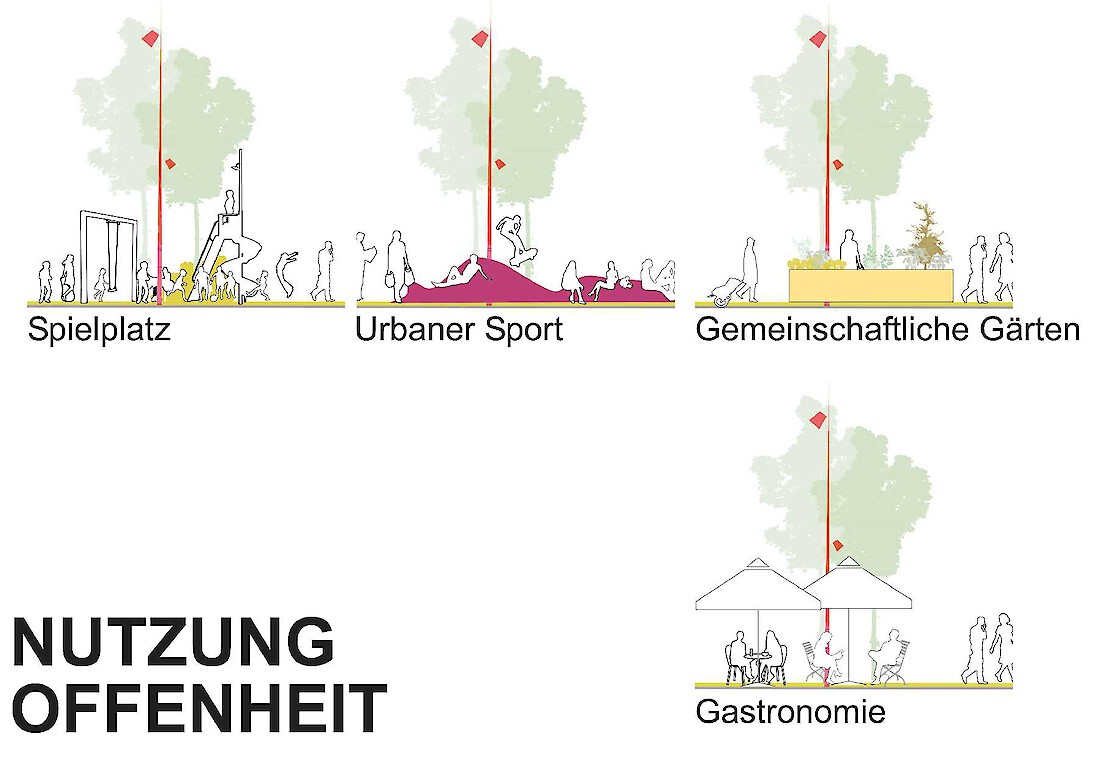Eine temporäre bzw. saisonale Nutzung, die langfristig in eine definitive übergeführt werden kann, ist entscheidender Bestandteil des öffentlichen Raumkonzeptes. Testartig können unterschiedliche Nutzungen und Raumdisposition ausprobiert werden, um sie dann langfristig zu etablieren. Die Idee einer langfristigen resilienten Stadtentwicklung mit klarer Phasier- und Etappierbarkeit liegt allem Handeln für die Zukunft zu Grunde. Auch die Entwicklung der Flächen von Möbel Martin sollten langfristig überdacht werden, um sie in ein robustes, kohärentes städtebauliches System mit porösen Blockstrukturen wie auf der Nordseite der Ostspange zu überführen.