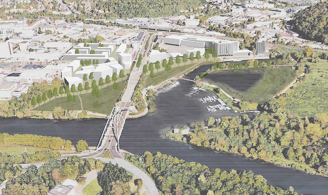 Die Landeshauptstadt Saarbrücken hat in Zusammenarbeit mit der Gesellschaft für Innovation und Unternehmensförderung mbH (GIU) ein Mehrfachbeauftragungsverfahren mit fünf Teilnehmern durchgeführt. Aufgabe war es, Vorschläge für die städtebauliche Weiterentwicklung der südlich und östlich an das von Möbel Martin geplante Einrichtungshaus angrenzenden Flächen zwischen der Straße „An der Römerbrücke“ und dem Altarm der Saar im Osthafen zu erarbeiten. Auch die angrenzenden Bereiche des Schlachthofquartiers, das Silo, das Rhenania-Gebäude und das Römerkastell sollten in die Planung einfließen.