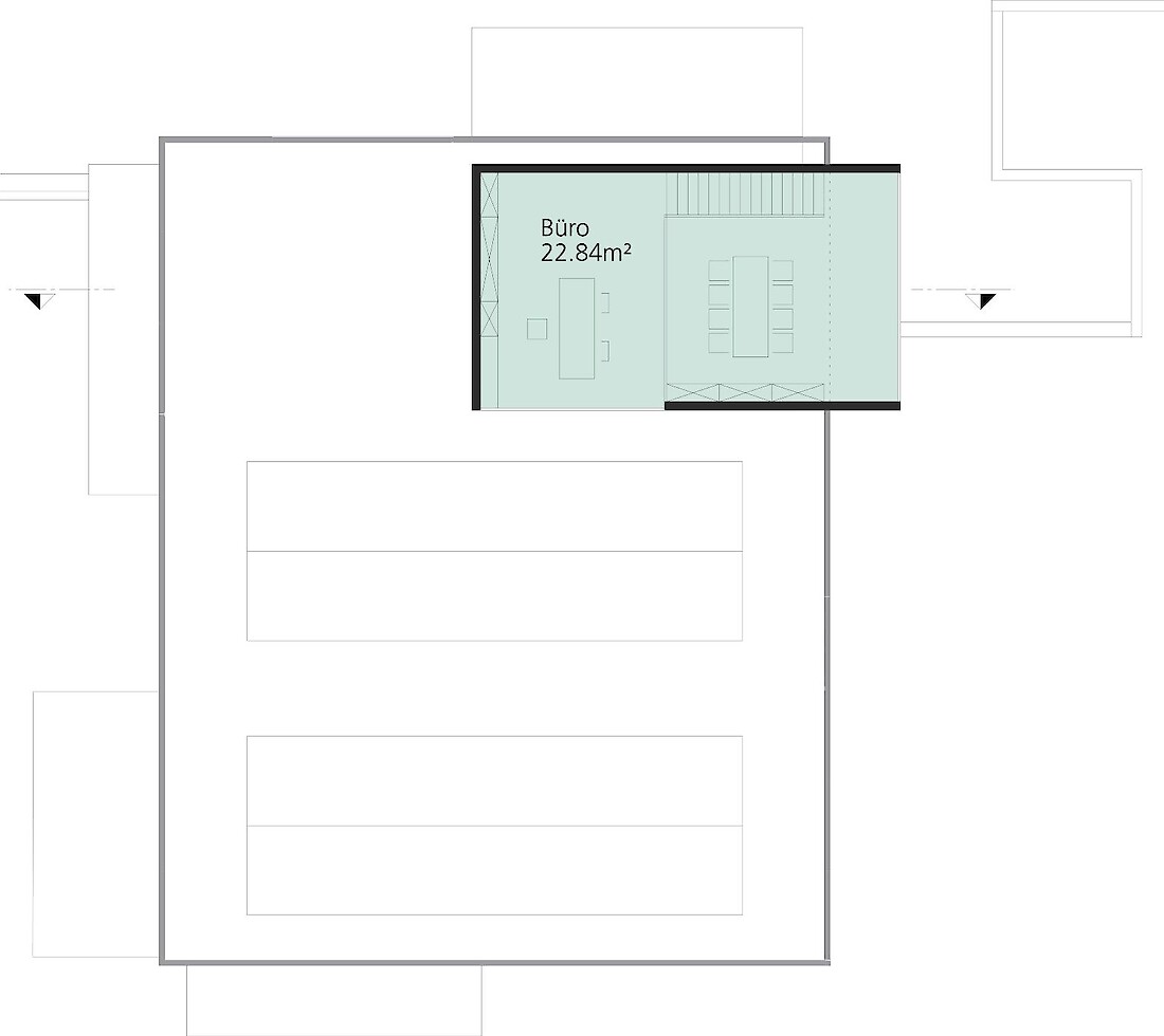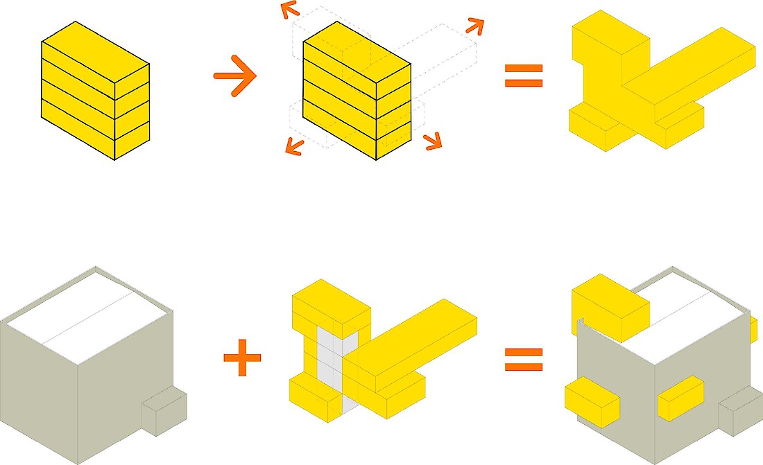 Der Innenraum der Fördermaschinenhalle wird beherrscht von dem mächtigen Förderrad. Es ist der wichtigste „Zeitzeuge“ in der Halle. Ein Augenmerk der Aufgabenstellung war es das bestehende Förderrad in das neue architektonische Konzept einzubeziehen und erlebbar zu machen. Der neue Einbau soll sich um das Förderrad herum wickeln und aus verschiedenen Höhen den Blick darauf bieten. Baukörperlich drehen sich die Boxen um einen Kern, welches die „Wirbelsäule“ des Gebäudes bildet und funktional der Erschliessung dient. Von da ausgehend, greifen die Etagenboxen, orthogonal zueinander, fingerartig in den Luftraum, um dann die Aussenhülle zu durchstossen. Als Hülle wird ein goldfarbenes Textil über die Konstruktion gespannt. Die Neuen, die Aussenhülle der Halle durchbrechenden, Teile der Konstruktion werden mit goldfarbenen Messingblechen verkleidet. Die neue Nutzung im "Goldfinger" zeichnet sich deutlich ab, wahrt aber den Respekt vor dem historischen Gebäude.