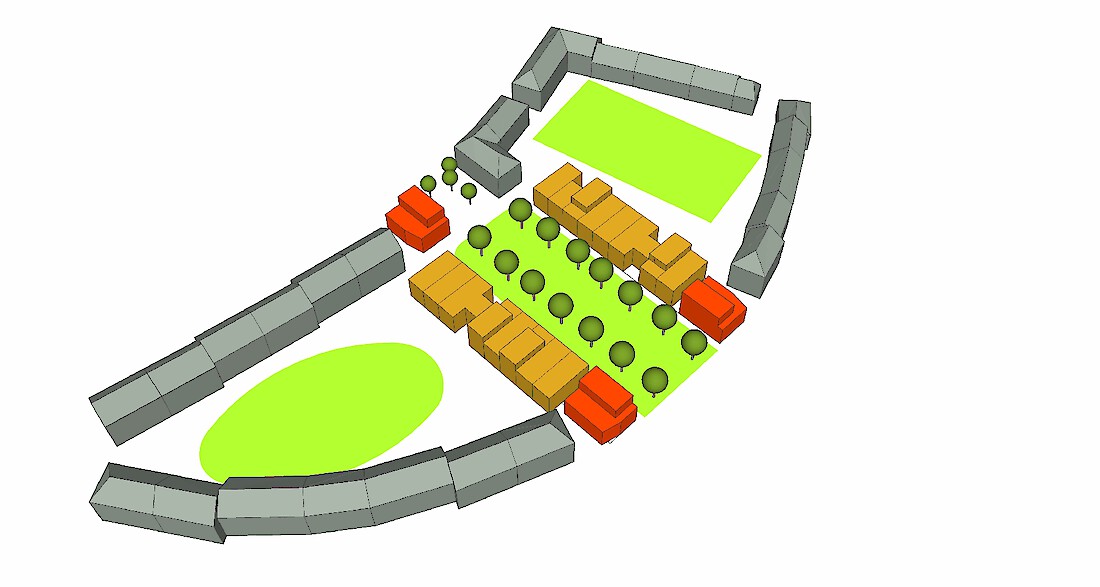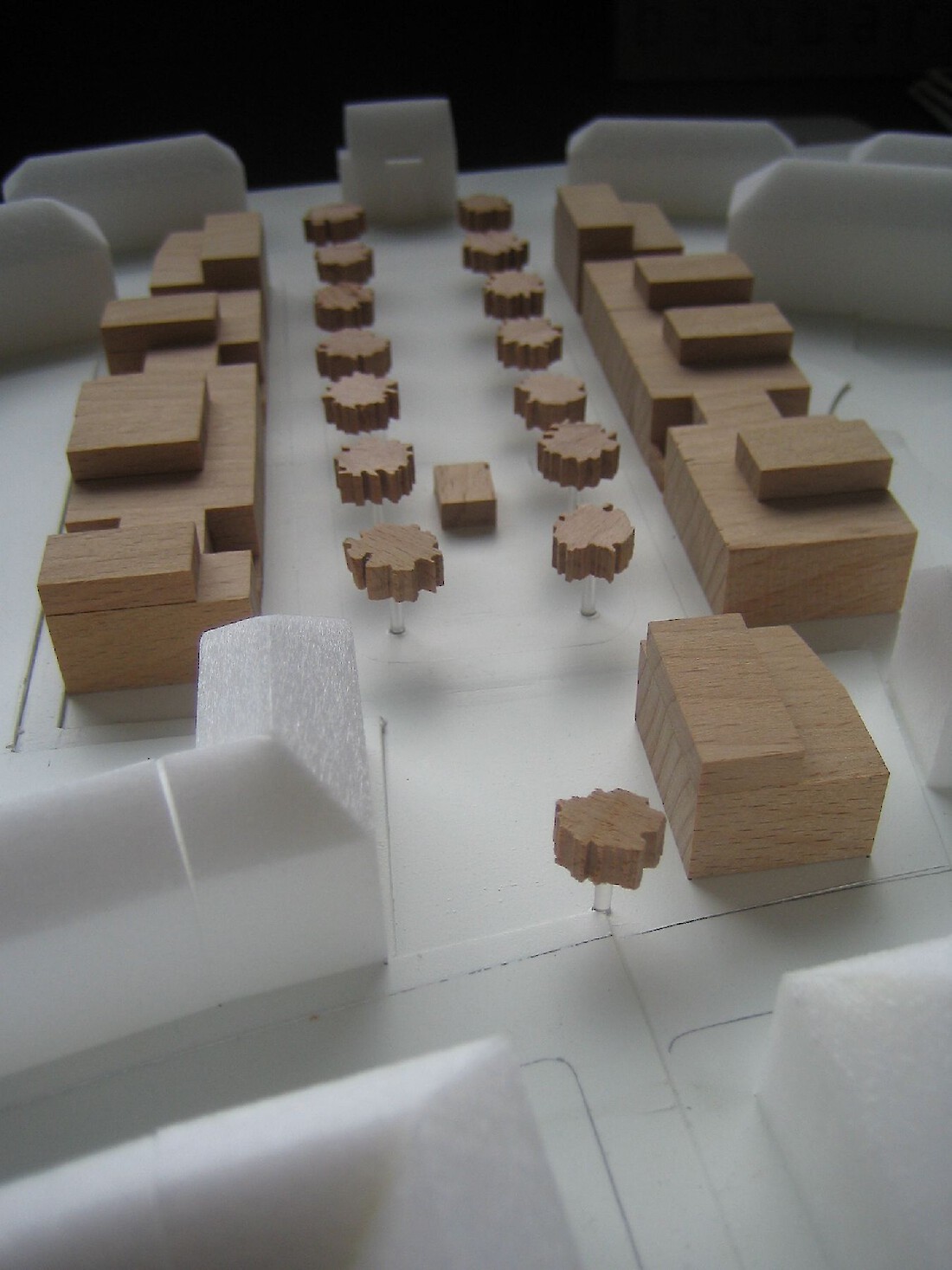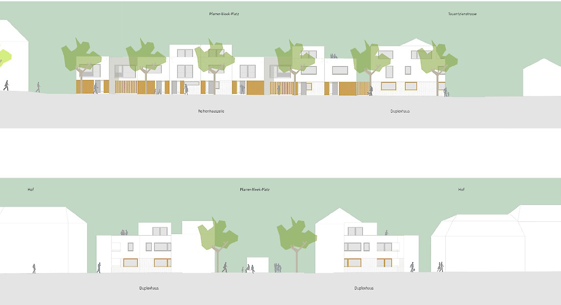 Grossgewachsene, mächtige Platanen säumen den Platz. Die schmale Strasse und der Gehweg, beide mit Naturstein gepflastert umschliessen ihn. Ein ruhiger Ort mitten in der Stadt. Eine fast schon privilegiert zu nennende Wohnlage wird für urbane Ein- bis Zweifamilienhäuser zur Verfügung gestellt. Parallel zum Platz entwickeln sich zwei Wohnzeilen, 2-3 geschossige Stadthaustypen für Familien, mit Punkthäusern an den Platzeingängen. Die Platzmitte bleibt weiterhin frei und wird zum Herzen des Quartiers. Städtebau und Bautypen Die Platzeingänge werden mit grösseren, frei stehenden Wohngebäuden betont. Sie schaffen einen spannungsvollen Übergang zwischen der bestehenden Bebauung der Tauentzien- und Bülowstrasse zum Pfarrer-Bleek-Platz. Wir verstehen den Entwurf als ausbaufähiges Grundgerüst, welches geeignet ist, auch über die vorgeschlagenen Bautypen hinausgehende Varianten, differenzierte Wohnformen aufzunehmen.